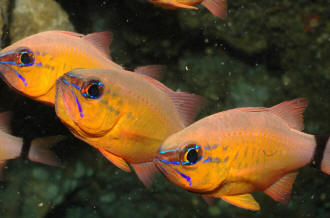Ostorhinchus aureus (Lacepede 1802),  the Ring-Tail Cardinalfish. Black bar encircles caudal peduncle. Indo-Pacific; Red Sea, east Africa to New Caledonia. To nearly five inches in length.