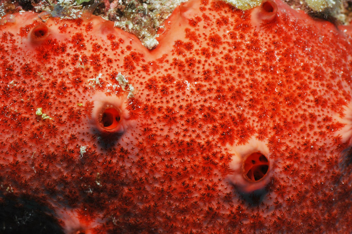 Sponge. Cozumel pic. Size 6-18 in. Bright red, with surface showing