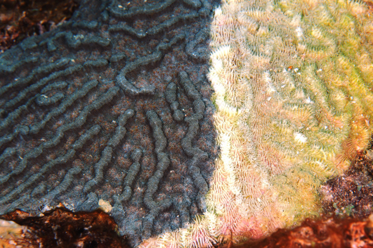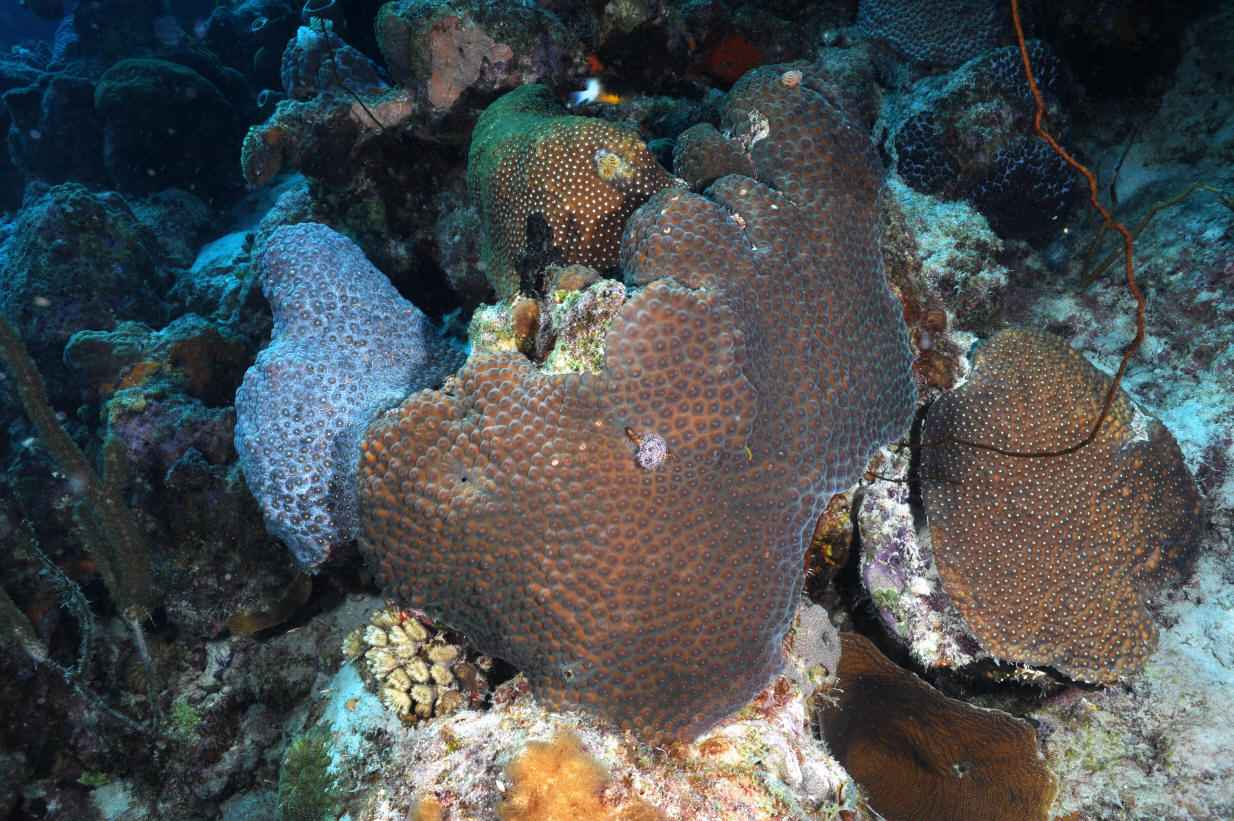 Coral. Colonies as flat plates, mounds, domes. Ridges about edge