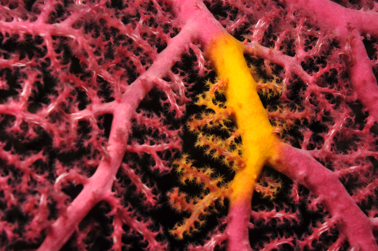 A nice rose coloured gorgonian in Fiji w/ an interesting yellow "blem".