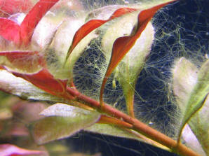 algae eating sharks.-Chuck> Chuck.> Black growth in planted tank Dear WWM, I have a 55gal planted tank, running an old Whisper 3, and a pair of 24" 50/50 bulbs. A black, tufty plant/fungus has started growing on the driftwood and filter intakes. I've tried scrubbing it off, only for it to grow back almost overnight. My Otocinclus cats and Corys ignore it completely. The fish don't seem to be bothered, and my swords and java fern continue to grow well, it just detracts from the appearance of the tank. Can you tell me what it may be, and how to keep it in control without having to pull it all off daily. < This is called beard algae. It is caused by an excessive nutrient in the water. You need to do more or larger water changes to remove the excess nutrient in the water. Siamese algae eaters and Garra Species (African Stone lapping fish) work great at keeping it under control but it takes time. -Chuck>