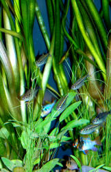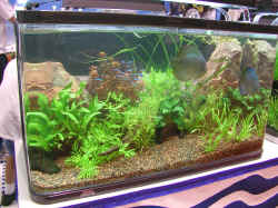 Basic Aquatic Plant Living Requirements & Conditions: Light and Lighting: Adequate light quality, duration, and intensity is necessary for photosynthesis, "making with light", by definition. 1) What type, 2) how long and 3) how much? Read on. 1) Full spectrum, i.e. the wavelengths that our Earth receives via our star the sun are best. There are fluorescent and metal halide fixtures and lamps that will get you these. Ahem, I would point out that aquarists "kept" plant tanks long before artificial lighting; by using (in)direct sunlight. 2) Time: A good eight, ten, twelve hours per day, preferably on a timer so you don't forget. 3) Light requirements: A guestimate of how many watts or lumens per whatever can be deceiving. The depth, turbidity, dissolved color, reflectivity of the surface. species-specific needs... among many other factors all must be figured in. As a very rough rule of thumb, 2-4 watts per gallon, 30 per square foot of surface. Gravel: A consistent grade of finer (1/16 to 1/8" nominal diameter) gravel of a few inches depth is ideal. If you are sloping the substrate substantially, glass, rock, driftwood terracing should be employed to prevent the inevitable gravel-slide. "Natural" gravels are superior in many ways to epoxy-coated colored varieties; and they cost considerably less. Soil: Is it worthwhile to place peat, and/or a loamy clay underneath your gravel? Yes, if maximizing plant health is your goal. Is it necessary? Decidedly not. Nutrients and other benefits that accrue from sub-gravel soil placement may be supplied through commercial solid or liquid supplementation, or for low-nutrient requirements, by fish food, wastes. Filtration, Circulation & Aeration: Some of these are desiraable to remove solids, keep the system destratified chemically and thermally, and prevent the ills of water stagnation on the bottom. All this being said, aquarists tend to over-do it filter, circulation and aeration-wise. Adequate water movement without introducing air is the target you want to acheive. Your plants will do better with some circulation, but most types don't thrive if continuously buffeted. Bubblers of different sorts are likewise contraindicated for their role in driving out carbon dioxide. In my opinion the ideal filter/circulation unit is an inside power filter for small tanks, and an outside canister or hang on the back for larger systems. Obviously, arranging for intake near the bottom and discharging the return underwater, away from the intake is preferable. Though their role is controversial, and can be countered with blind potting and barriers, undergravel filters are inferior forms of filtration for plant tanks. Temperature: A simple consideration you would think, but many of the plants sold as "tropical" are not. Egeria (one of the genera sold as "anacharis") foxtail (Myriophyllum), the rushes in the genus Acorus, Lagarosiphon, barely tolerate water in the mid-seventies. Reciprocally tropical aquarium plants may die if temperatures dip much below 70 F. Like the fishes you know, plants have ranges of tolerance and optimum growing temperatures. You must investigate what these are in reference works. Water Quality: Can you define this elusive aqueous condition? More than just any given measure of static pH, dissolved oxygen, redox potential... water quality exists as a dynamic range and shift of many interactive values. Ideally, for us as aquarists, the concentrations and circumstances of our systems "water quality" favor (stable and optimized) the intended life in our systems. Bringing this down to "brass tax", the things we can measure and manipulate, just what does this mean? The following: Alkalinity/Acidity and pH The pH of a solution is a relative measure, a point on a scale, of hydrogen ion concentration. Alkalinity and acidity are different, related and just as important; they refer to the buffering capacity of the system. In other words, the degree that chemical species in the water resist change in pH. Thus you can understand that two or more bodies of water can have the same pH, but very different buffering capacities. This point bedevils beginning aquarists; "Why won't my pH change when I add the drops/granular the way the instructions call for?", and then, "Oh my gosh, what happened, the pH wasn't shifting and all of a sudden it went off the scale?" The alkaline (on the pH scale above 7.0) or acidic (below 7.0), reserve was "exhausted" by the addition of counteracting chemical, and more added, the pH point was driven up or down. Know this; for most localities water, alkalinity and pH are not worth fooling with. The living system which is your aquarium has a wide range of tricks to accommodate them. If you should have abnormally high alkalinity ( > 3 mEq) that your animal and plant mix disfavor, I suggest blending reverse osmosis, otherwise filtered water with some of your tap to bring the value down. Alternatively, if your water has too little alkalinity, a store bought, or home-formulated mix of buffering agents will raise the alkalinity value to a point of sustainable pH and buffering range. You want/need sufficient buffering capacity to ward off extreme shifts in pH during night and day. A pH value that is too high can be and is a real problem in many parts of the U.S.. This phenomenon affects the solubility, and usability of nutrients and many life functions. Many aquarists complaints with live plants can be cured with an understanding and manipulation of this variable. Once again, beware; without a concurrent awareness of what buffering is and how it is related to pH, you are "playing with fire" simply trying to manipulate pH alone. A stable range of pH near 6.5 to 7.5 is desiraable, but how you get there may make all the difference. Do avail yourself of help with an alkalinity test kit, other aquarists help and enough "book learning" till you feel comfortable in altering the pH of your water. The surest way to avoid biological troubles with these ch