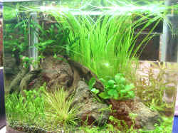 reading 6/16/09 Help with community tank. Planted tank... op. 6/5/08 I have a 55 gal. tank, fine gravel substrate, a large piece of driftwood, and a few plants so far. Temp is set to 78. Plants are mostly swords and baby's tears. <Echinodorus spp. and Micranthemum umbrosum need a lot of light, at least 3 W per gallon.> My lighting is terrible at the moment: tank came with a 20 watt light fixture I'm thinking I need about 200 watts of good, fluorescent light. What are your thoughts???? <Sounds about right.> I have a few additives for them, but not a real fertilizer. Do the ones that look like gravel, and you mix in with the substrate, work well? <They can work extremely well. I use pond soil under silver sand, but other people have their own recipes, and there are of course off-the-shelf mixes too.> Or do you suggest a liquid? <Best used as a weekly addition to top up the minerals as your tank develops.> I have a bubbler going at the moment, to help with the nitrifying bacteria. I plan to switch to CO2 soon. Is the CO2 recommended over the bubbler? <If you're after a planted tank, then yes, concentrate on CO2, and remove excessive water turbulence. You are only going to lightly stock this aquarium, so filtration can be relatively gentle.> I've had minor success in the past with making my own with water, sugar, and yeast in a 2 liter soda bottle, but I think the big tanks made need something better. <Doesn't really matter how you make the CO2, and both DIY and off-the-shelf systems can work well if configured and used correctly. For big tanks, the off-the-shelf ones might be easier to use and leave alone, but CO2 is CO2, wherever it comes from.> Suggestions? Arlene <Cheers, Neale.> Re: help with community tank. 6/5/08 I think you guys are awesome!!!!!!!!!!!!!!!! Love the targeted information and the quick response. Thanks for all your help!!!!!!!!!!!!!! Arlene <Happy to help. Good luck, Neale.> Converting an established aquarium to planted -- 11/13/07 Hello, I currently have an aquarium with gold tetras, gold barbs, rosy barbs, blue gouramis, a talking catfish, a blonde rubber nosed pleco and a red-tailed black shark. It has been established for about a year and I am interested in adding live plants. The substrate is just aquarium gravel (the coated kind) and the lighting is whatever came with the hood I purchased. Would I need to add anything to the substrate? How would I go about doing this without upsetting the balance in my tank? What kind of plants work decently with these fish? What is a good, relatively inexpensive light for the florescent hood? I tried putting in a couple plants before as an experiment but they didn't seem to take root. I'm new to live aquarium plants, so anything you could tell me would be appreciated. Thank you very much, Amy <Hello Amy. Plain washed gravel isn't viable for most plants. Think about it: if you stuck a garden plant into a bed of driveway gravel, would you expect it to grow? Aquarists keeping plants need to factor in a whole bunch of things. Substrate is important, as is bright lighting, fertilisation in the water, and carbon dioxide. As a basic plan, you need a substrate containing a mix of fine gravel and some sort of supplement such as laterite or aquatic soil. You need lights that provide at least 2 watts per gallon of water. Iron-rich fertiliser needs to be added to the water at least once a month. Carbon dioxide fertilisation isn't essential, but it helps, and is the secret to those amazing planted aquaria you see in the magazines. How you solve all these issues can be as complex or expensive as you want it. In my planted tanks, I use pond soil and fine gravel from the garden centre, which costs very little compared with buying the "real" things from an aquarium shop. The substrate is in two layers: a 5 cm mix of soil and gravel at the bottom, and then a 3-5 cm depth of fine gravel on top. For tanks 50 cm or less in depth, plain fluorescent lights will work. I have four full-length tubes on my planted tank, and that seems to be the minimum for good results. Barbs tend to nibble on soft plants, so choose robust species. Amazon swords, Vallisneria, Anubias, Java fern, etc will be fine. When you're setting things up, take the fish out and place them in 5 gallon buckets with lids (essential bits of equipment in my opinion). Put the filter in one of these buckets, and leave it running so the bacteria stay alive. Empty the aquarium. Take your time arranging the substrate, and then put new water in. Plant the tank, leaving room for growth. By the end of the day, the water will clear up and you can return the fish. Do buy, read a book on aquarium plants before proceeding. There are lots of "fake" aquatic plants on the market, and these are widely sold, often cheaply. They die in fish tanks. Choose plants suited to your water chemistry and lighting conditions. Cheers, Neale.> Planted Tank Doesn't Pearl - 10/22/06 Hi, I currently have a 30G tank which is partially planted (I'm still looking to fill in the open spaces in parts of the tank) with Limnophilia indica, Ludwigia Repens and arcuata, Anubias barteri v. 'Nana' and Cryptocoryne wendtii. I have two rummy nose tetras (will be adding more once I get the conditions right in the tank) and a few pesty snails. For lighting I have a 110W PC unit (on 11 hours/day) with a DIY CO2 system and a fluorite substrate with small gravel on top. I add potassium at the rate of 4mg/L per day (can't test for it, but based on various websites you really can't OD your tank with it) and I dose phosphates to a 16:1 ratio with nitrates (to the best of my ability and I'm definitely not perfect). I also dose Seachem Flourish 2X week and Flourish Iron 1X week. My water parameters are: temp 81 degrees F (hard to lower due to NYC apartment heating issues), pH 6.6, GH 6 dH, KH 4 dH, Phosphate .2-.25 mg/L and Nitrates 7 mg/L. I don't dose nitrates since they occur in the tank naturally. Now that you know the deal with my aquarium 