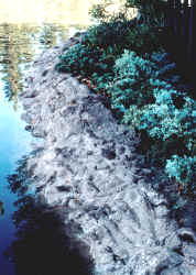 There are several approaches to repairing concrete water features. Human nature dictates that you will want to put in the least amount of time and money to achieve the desired result. There are as they say, "many roads to Rome"; this Section details the most appropriate strategies for repairing leaking concrete water effects. Water basins made of cementatious materials may leak due to cracking, wear or poor construction. These repair problems are common in our interest and their expedient repair constitutes a large market. The application of various repair technologies can best be described in order of least cost and effort versus perceived scope of job and likelihood of success. Approaches : Simplest Problem/Solution To Disaster/Salvation. 1) Individuals facing water feature repairs have several options to choose from. At the lowest end of the spectrum, they can do nothing! i.e., abandon the system or keep adding water periodically as it disappears. This may present real problems in terms of material leaching back into, poisoning the system or outside damage due to leakage. 2) If the basin/s and fall/s are intact with no visible large cracks and the structure is stable (check for adequate soil compaction and/or other support) a coating of asphalt-based emulsion (e.g. Henry's or Marvin's) or epoxy-based paint or cementatious foundation coating or repair material, may be applied in "bad" areas or more appropriately over the entire surface. The "foundation coating" technology is so prevalent and important in cementatious feature construction and repair we will give it separate treatment in the following Section. Desired surface color and texture will dictate which type of coating to use. Note: "clear" sealers and penetrants designed to treat new concrete will not work on cured concrete leaks. 3) If hairline to large cracks (more than an eight inch) are evident and the basin is otherwise stable, you can chip out the damaged spot to expose a new, clean surface and try to remedy (band-aid) the area with a patch of silicon-rubber based material, specialty hydrated calcium silicates (e.g. foundation coatings) or epoxy-based materials. The prognosis for such "repairs" is not good; at best they are temporary measures that will eventually fail. 4) For repairing the more serious "moving" and "growing" hair-line cracks, one should use an elastomeric (stretching) repair system. These are most commonly polyurethane/bitumen or chlorinated-rubber based and can be applied by brush, trowel or specialized spray equipment. These materials have a high tensile strength (elasticity) and can be applied to the questionable areas alone, or better still, over the entire basin & back of fall surface. It may be necessary and/or is strongly advised that these elastomerics in turn be coated over. Read and follow the manufacturers' instructions thoroughly. I will leave off with telling you my "horror stories" regarding "advice" from counter help and "field technicians", instead to re-emphasize that you read and follow all printed materials to the letter. 5) Situations where rocks go through the basin wall (always a disaster), large cracks, questionable compaction and obviously unstable walls call for the most drastic action. In this, the worst scenario, it may be necessary to remove all of the existing structure and start from scratch. This, of course, costs more than doing the job right the first time. However, don't despair, there may be some salvation! At this point, the failing system may be left in place and the basin considered a mere hole in the ground in which new walls, fall/s and bottom are constructed over old. One common method is to apply a cement or plaster coat over the entire basin surface. This coating consists of plastic cement, sharp sand, water and possibly a coloring agent. For added strength this method may be modified by adding a reinforcing mesh to the "new" basin. Hexagonal chicken wire in two meshes, welded wire, and for very large systems, tie-wired rebar may be called for. This is not, however, the most sure-fire method. The most-appropriate, best-available technology consists of retrofitting a liner of thick rubber or vinyl over the existing surface. For falls, a trough is constructed as a water-proof base/form and the liner is fitted over it. This is adhered to the basin liner, making a continuous water-proof membrane. The liner may be economically left as it is, but to ensure against rips and punctures, it is prudent to apply mesh and mortar over all as above. If more rock work is desired, this can be done at this time or later. This is the best method of repair in terms of guaranteed long-term leak-proofing. Pond Coating Tools & Materials Check List COATING Applicator(s) Coloring Agents Mixer Hose Nozzle Acid Trash Can Bleach Flat Shovel Pump Broom Discharge Hose Dust Pan Brush - Nylon Vacuum (Shop Vac) - Steel Extension Cord(s) Extension Pole Rags Landscape Trimming Tools Tools Chisel Account Folder Hammer Sand Paper Safety Equipment Solvent Gloves Eye Protection Boots Masks Other Considerations: Plumbing may be a primary or secondary problem in dealing with leak problems of unknown or "known" origin. It is strongly advised that all plumbing lines be pressure tested before wasting time and money on repairing the concrete (see Section on Plumbing). It may almost go without saying that the system must be absolutely clean and dry before making these repairs to ensure proper adhesion. How do you go about deciding which of these technologies applies to the situation at hand? Read the above carefully! Evaluate the source of the problem; apply the appropriate method; don't take short cuts that may not work. Your success with these different repair methods will vary proportionately with the amount of time, energy and money you are willing to invest. How to effect these repairs? By following the steps to completion, employing the tools and materials as listed, you can make this a DIY project. Do