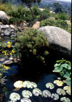 Sandy soils can be a blessing in pond construction, allowing for easier digging, forming of basins, and laying of conduits for water and electricity, and providing quick drainage of misplaced water. If you've ever dug holes in both hard and soft soils you'll agree. Let's take a general overview of pond construction, with emphasis on how to build an in-ground water feature in a loose-soil setting. Design: The same considerations hold for soft-ground pond-planning as for heavier clay-based soils. You want your basin to be large enough to keep plants and fish; deep enough to be stable; steep-sided enough to keep the fish from jumping out or predators from wading in; sited conveniently enough for easy viewing and close enough to electricity and water to maintain easily. I can't emphasize enough the value of making scale drawings of your proposed pond, filters and other gear, superimposed on a layout of the space available. Sketching in the immobile elements like trees, rocks and buildings... and figuring in paths for walking and mowing, will not only keep you out of trouble, but will also give everyone involved with the project a clear picture of what will be built and how the pond will tie in with the rest of the landscape. I like to make such plans on quadrille paper for easy scaling, and add scale-model paper rocks, basins, falls, filters and other elements that can be moved around on the plan. When it comes time for actual siting outdoors, there's nothing like a simple garden hose arrayed on the ground in the shape of the pond's perimeter to gain a clear understanding of the size and shape of the system. Digging: For small systems (hundreds to a few thousand gallons), hand-digging with shovels and pickaxes may be the best available technology. For large systems that readily allow access for earth-moving equipment, I advise the use of a backhoe and possibly a skip loader for moving the soil elsewhere. A skilled operator can dig a pond to specification in a few hours. Steep sides and curves can be accomplished by the operator or created by hand with a shovel. Keep in mind that you're likely to need some of the excavated soil for filling behind the constructed pond walls. Don't have it all hauled away. Have a tarp available to store sufficient soil (or sand) for backfilling. Construction: The chief difficulty in construction in sandy soils is getting the walls to stay up. For cementitious-type construction (concrete, block, liners and cement/aggregate) it is imperative to start at the bottom. By laying in or pouring the base first, the mass of the vertical walls can be adequately supported. Liner-only ponds or pre-made constructs (such as resin and fiberglass or polyethylene) are a different matter, calling for careful excavation and provision of as solid a berm as you can arrange. Using liner with concrete and reinforcing mesh creates the strongest, easiest to build, most permanent basin formation. In sandy soils, as little backfill area as possible should be cut away. Original grade is desirable because it is more compact and less resistant to "giving" (compaction) in the construction process. Don't dig any more than necessary! Once the basin is dug to your satisfaction, a series of stakes or lengths of rebar a couple of feet long are driven into the ground along the berm to act as anchoring for the liner and reinforcing mesh (made of chicken wire and stucco cloth which to "hang" the small-aggregate concrete). Typically, a pencil-diameter rebar will suffices as a surround, attached with large metal staples or wire-tie onto the stakes, with the line and mesh hog-ringed on. When the liner is down and staked to a surrounding berm, concrete or shotcrete can be pumped in or hand-paced, first in a thick bead around the bottom edges. You want to avoid "cold joints", but give the first bottom beads at the wall junctions time to set up a bit. Then, apply, more concrete at the wall bottoms and work it up by hand into the reinforcing mesh and between it and the liner underneath. If the basin's deep or there is a desire for vertical walls, a "bounce beam" wall of plywood can be easily constructed behind the liner and the area backfilled behind it and compacted. Have someone watch to assure the plywood's placement during concrete application. The berm of a pond built in softer soil is generally wider than one in more solid ground construction, but is easily disguised with rock work (best placed while the concrete edge is being set) and plants. Block Wall Ponds: Block wall ponds built in sandy soil need more substantial foundations and more backfilling of the area behind the walls. I encourage you to run at least #2 rebar into every cell in the block, in order to tie it in with the horizontal rebar in the bottoms, and to fill all block with concrete for added strength. Swimming Pool Methods: A great deal of extra material (gunite mortar made of sand, cement and water- no crushed rock aggregate) is applied in swimming-pool-type basins- shot over and through reinforcing steel that is tied together. The resulting "shell" is then plaster-coated. If you are planning a large, deep system, this type of construction may be the best available, most appropriate technology for you to use. Sandy soil areas are often fitted with a plywood "bounce beam" as mentioned previously. Otherwise, the subcontractors doing the gunite work simply bid in more material to make up for the backfill area. Liner-Only Ponds: Liner-only ponds are the most difficult types of ponds to erect on sandy soils. Far too often, through simple erosion, an edge of the pond "falls", allowing water to further erode the side. What is needed here is a sturdy edge to hang the liner onto. The best support is sheets of plywood covered with used carpeting (to prevent puncture. After digging out the basin, a side-frame of ply is cut (1/2" is fine for pond walls 2' deep or less), fit into place, and tied together with stripping from behind. This is overla