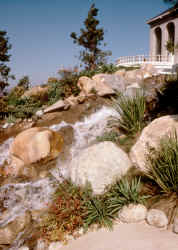 Waterfalls provide aesthetic and functional elements to a waterscape: sights, sounds, aeration, oxidation of wastes, dissipation of chlorine are the most noted benefits. Design: There are as many different designs as there are waterfalls themselves. As we have mentioned in previous articles on design, consideration must be given for the effects of splash and wind to keep the water in your system. The provision of drops and pools in a fall design versus semi-smooth hissing, gurgling streams is more a matter of taste than function. It is suggested you visit and sketch as many operational falls as practical to gain an understanding of your design.