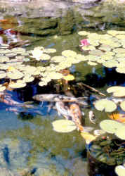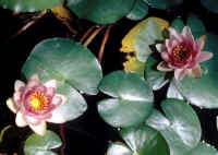 Night Bloomers Paul Hariot (apricot) Dentata magnifica (white) Wm. Falconer (garnet red) Rubra rosea (carmine) Helvola (pygmy yellow) Missouri (creamy white) Water lilies are purchased from water garden mail-order outfits, local nurseries, and sometimes "fish" stores and fellow hobbyists. Most grow like proverbial "weeds" (Plants we've yet to find a practical use for), so please do "share the wealth". Pots/Planting: Hardy water lilies have got to be one of the easiest plants to grow in the world. All that is needed is to press a good few inches of the sprouting root or rhizome into soil, leaving the growing tip above and cover with sand, gravel and possibly a stone to prevent the plant floating out. Hardy types are planted at a 45 degree angle against the side of their container, tropicals should be planted level in the center (illustration) in as much sun as possible in calm, quiet water. Hardys are planted out in early Spring and flower in about six weeks. They may be placed out till late Summer, but you may have to wait till after Winter to see the fruit of your labors. Periodic and Annual Care: We will cover more of this arena two Sections on, but the basics of water-lily care are a minimum 3-4 hours of direct sun, decent water quality, removal of dead leaves (yellow-brown) and control of any insect pests. Aphids, cutworms can be easily and safely controlled by spraying them with a five percent solution of Ortho's Volck (tm) Oil Spray. Fertilization and Separating/Re-Potting: I'll mention these together, as they should both be done about once a year. There are references that "plug" the use of organic and loose nutrients (blood and bone meals, cow and other manures); I'm so against these practices, I won't elaborate on them. Instead, you are encouraged to utilize inorganic feeding "tablets" or possibly "granules" on an annual basis when you remove, clean and seperate your plant-stocks. This is a big job that should be approached in a planned, systematic manner, as it involves large scale disruption of the system and potential for injury. It is a good practice to remove and replace all or a good part of the potting soil and cover every year. "Older" non-living portions of tubers are discarded and the growing tips of hardys and tropicals and the corms of the latter are re-planted with new fertilizer. Take care not to over-plant your pond with too many lilies, they need room to spread out; leave room for water to show between the leaves. Don't cover the pond water's surface any more than 60-70 percent. "Normal size" hardy lilies need a two-gallon container each, tropicals a bushel basket, and Victorias a swimming pool. Soil can be from an ordinary garden with no peat moss, rotted wood or pesticide contaminants. Use pea gravel graded to large enough stone material to discourage "rooting" of plants by your livestock. Some folks boost flower production by periodic (monthly) fertilizer feedings, iron supplements and more; I generally find this unnecessary. It is dangerous to slip-slide on biological pond surfaces and sometimes too much of these chemicals getting loose can be dangerous to plants and fishes. If you are going to "push" your plants, construct a "fertilizing" stick to jam tablets into their surrounding soil while standing safely outside. Over-wintering outside of the pond is necessary for all areas where the water freezes down to the lilies. By the first signs of frost, pull the containers (or plants) out of the pool and remove all the older long leaves and blossoms. Store the bare rooted plants with some wet soil in sealed plastic bags (or "pickle" buckets) out of the light and freezing cold for next Spring. Maybe you should include a label so you can tell which color/variety you're replanting the following year? Good idea. When can you re-plant? After the last frost in your geographical area, ideally for tropicals when the water temperature is in the 60's and rising. Reproduction: Nymphaea propagate in three ways; by splitting asexually at the rhizome and at the center of mature leaves (some of the tropicals), and sexually by seed. Asexual buds may be separated when they are a few inches long each, and viviparous tropical "pups" can be cut away with a sharp knife, potted, and placed in shallow water when they develop roots. Most lilies are sold and cultivated as rhizomes or tubers, but you can grow them from fertile seeds. They can be self-fertilizing or "manipulated" with a cover and "brushed" with the pollen of another plant (hardy for hardy, tropical/tropical). This is no simple feat; see Strawn below for insights/help. Summary: There are no flowering plants that are easier to grow in ponds than water lilies; nor any that rival them in attractiveness and color-range. With your first efforts at their cultivation you will be successful and become a "nymphaea maniac" (note to Editor's, not a nymphomaniac; please don't misspell) Bibliography/Further Reading: Masters, Charles O. 1974. Encyclopedia of the Water Lily. T.F.H. Publications, NJ. Randall, Louis E. 1986. The astonishing Victoria water lilies at Longwood Gardens. The Green Scene 5/86. Strawn, Kirk. 1988. Hybridization of hardy water lilies. Water Gardening Journal 3/88. Uber, William C. 1988, Water Gardening Basics. Dragonflyer Press, CA. Wischnath, Lothar. 1995. An introduction to water lily cultivation. Tropical Fish Hobbyist 7/95.