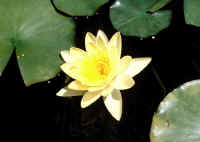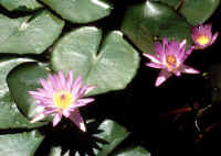 A Truly Giant Water-Lily The night-blooming tropical water lilies include the amazing, gigantic Amazon water lily Victoria regia (V. amazonica) named in honor of Queen Victoria. This south American giant has leaves up to seven feet across, with edges turned up about three inches in height. The pads' undersides are a nightmarish array of thorns up to an inch long. You may see this monster if you visit a public garden that can afford the pool size and heating cost to sustain it's tropical temperature. Another Victoria, V. cruziana (Trickeri) is easier fare for slightly lower temperatures. It's leaves are a little smaller with correspondingly higher turned-up edges. Water Lily Selection: There are a dizzying assortment of varieties to choose from. Bear the following question in mind when making a selection; "How big will these plants get?", "Are they day, night bloomers, odoriferous?" "Where can I place this plant so that it receives adequate light, space?" "What color, shape flowers do I want?" My advice is to practice with hardy types of lilies first; they are less money and "hardier"; not surprisingly. The "common" colloquial names for lily varieties come and go with popularity and supplanting by novel hybrids. The following is my personal list of 'standards' in the trade (& color blossoms) that are in my opinion best suited for all applications: Hardy Water Lilies: Tropical Water Lilies Albida (white) Day Bloomers Attraction (white) August Koch (lavendar blue) Chromatella (yellow)<see above> Mrs. Pring (white) Escarboucle (vermilion red) Panama-Pacific (reddish purple) Gladstone (white) Pennsylvania (bright blue)