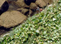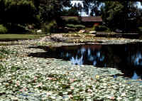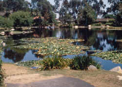 3) Pumped up Water: Needs to be left on longer to raise the lakes depth, and dilute the ever-incoming nutrients. This is cheap insurance and wise management practice, though, yes "it may rain" and a good part of the water wash away. Close: Wouldn't you like to live in such a setting? Me too! I remember the shock of being told that the homes around this private lake were going for one hundred some-thousand dollars in the early seventies; I couldn't believe it! "Wow, who has that sort of money?" Now, they're several hundred thousand... in large part because of the attractiveness of their central feature. In fact the community is called... Lake Helix! With some stepped up plant management and the addition of an aerator/destratifier the recirculating pumps operation could be cut back and the lakes appearance and function enhanced appreciably. The Home Owner's Association has heard my pitches for this set-up over the years and I've no doubt such will be adopted within the next few years. Bibliography/Further Reading: Fenner, Bob & Rick Aspray 1983. Ornamental fish ponds. Filters: design, construction and maintenance. FAMA 6/83. Fenner, Bob 1988. Water Effects: size and shape. FAMA 5/88. Fenner, Bob & Matt Tsunoda 1988. Waterfall construction. FAMA 11/88. Fenner, Bob 1988. Aquatic Gardens: Plumbing. FAMA 12/88. Fenner, Bob 1989. Pumps: An introduction. FAMA 1/89. Fenner, Bob 1990. Upflow filters (for biological ponds and multi-tank systems). FAMA 2/90. Fenner, Bob 1990. Pond construction: (Processes in) Building concrete and liner (production) ponds. FAMA 9/90. Fenner, Bob 1991. Thorosealing cementatious water features. FAMA 5/91. Fenner, Bob 1994. Pond construction methods. FAMA 5/94. Fenner, Bob 1994. Concrete and block construction of ponds. FAMA 6/94. Fenner, Bob 1994. Filter media for ponds: A discussion. FAMA 8/94. Fenner, Bob 1993. Electricity and electrical use around water gardens. FAMA 12/93. Fenner, Bob 1994. In-pond (versus outside) filtration. FAMA 9/94. Fenner, Bob 1995. Selecting a site for your outdoor water feature. FAMA 5/95. Fenner, Bob 1996. Plants and planting for water gardens. FAMA 6/96. Fenner, Bob 1996. Surrounding landscape plants for your aquatic garden. FAMA 9/96. Fenner, Robert M. 1997. Aquatic Gardens; Designing, building & stocking a backyard pond. Microcosm, VT. Graphics Notes: 1) An overview of the lake itself, approximately 2 by 1 football fields in size, deceiving over open water, eh? 2) Detail of the Island-Bridge on the northern edge of the lake. 3) Detail of the boat dock, paddle-boats... dock made of pressure treated wood, in-water section supported by air-filled fiberglass floats. 4) The lake perimeter showing the shotcrete (small aggregate, 3/8", concrete applied with pump and air pressure) berm... this is penetrated by shore drainage lines periodically to alleviate "swamping" of the surrounding walkway by run-in. 5) Waterfall detail; yes, these are real rocks, real heavy... water recirculated via a dedicated ten horsepower pump. 6) Stream detail (dry at this time), powered by one of the two 35 horsepower pumps when they're not working in tandem on the greenbelt irrigation. The stream and waterfall runways are formed with waterproof liner material covered by wire and shotcrete, with the rockwork added and mortared in at a later date to prevent leaking. 7) Shows one of the three foot overflows... to the storm-drain system; just in case of the proverbial flood. 8) Into the pump-vault: Six inch cast iron pipe, on its way to one of the 35 HP pumps, showing the strainer housing, clean out access and a butterfly valve to secure the water, preventing loss of prime. 9) The two 35 HP pumps shown in series; one runs alone for the stream recirculation, both to boost pressure for the irrigation. Note the timed heat lamps. These come on as the pump(s) cycle off to prevent water condensation on the motor windings. 10) The sump pump and flexible green discharge pipe... this is supposed to keep extraneous water out of the pump & controller vault?... not a good idea. Much better to have bored a large outlet or two down slope of the enclosure. I trust in gravity. 11) An outside shot showing the pump room door (the enclosure is cut into the hill below the residences), and the all important electric meter and shut off. 12) The 500' well and related plumbing and meter. The pumped up water is iron and other solid-laden, but cost effective to extract, even at 11 cents a kilowatt hour. 13) The controllers to the potable water and alternative lake water, showing the bold notices regarding which one is to be actuated during the seasons. 14) A planter area in need of augmentation, showing the cast concrete planter wall; invaluable for keeping what you want where you want it. 15) One of more less disagreeable waterfowl picks, a group of mallards that have become "resident" from bread feeding, etc. This is about the maximum number you want for a four surface acre water effect. The noxious weed floating is the reproductive phase of Potamogeton natans. 16) Iris in and out of water; always a tasteful improvement. 17) Tropical lilies (of extended above-water stems and cool colored flowers) are periodically mixed along with hardies along the lakes perimeter. This tropical day-bloomer is "King of the Blues"; very odoriferous as well as beautiful. 18) "Honey, what's that invading the lawn?" Yikes, it's the dreaded Hydrocotyle. Pennywort can be a gorgeous addition in or out of the water's edge, and aid in erosion control... but also a royal pain to eradicate. Keep it in check. 19) Like fleas on a domestic pet, that's how I feel about the lowly cattail; this species, Typha latifolia. To be used only in confined areas or tubs. 20) The California sycamore, Platanus racemosa, with it's large maplelike leaves, makes a striking water's edge addition to large features. Their deciduous leaves are easily raked up. 21) A view of some of the hardy lily beds. The lake has large stands of the large yel