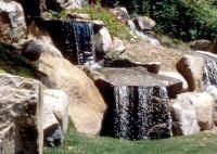 The iatrogenic problem alluded to comes from a lack of cooperation between the landscape and lake maintenance personnel; namely purposeful fertilization that makes its way into the lake. Liquid fertilizers, not granular, should only be utilized near the waters edge and then only conservatively. A pound of solid fertilizer can make a thousand or more pounds of vascular and algae weed material. Plumbing is of four separate plans. The northern waterfall has its own intake and discharge. The stream and irrigation lines are tied together with two in-series 35 HP pumps equipped with intake strainers, clean-outs and butterfly-valves . There are overflow pipes to the storm-drain system. There is an automated make-up system that has been secured to save money; and instead a deep (500') well can supply sufficient volume to keep the lake topped off and adequate water for irrigation. Quite a savings. Operation: Livestock: Forage is supplied by incidental insect and amphibian life, and two species of Sunfishes (Blue-Gills and Red-Ear Sunfish). The top predators are Florida LMB (Large Mouth Bass, Micropterus salmoides), and Channel Catfish. Some ornamental Carp, aka Koi, have escaped their stream pond confines to the larger lake below. Aquatic and bog plants are planted in the soil in and around the designated planters, and physical efforts are made to keep them from jumping their barriers. The plants are fertilized once a year via concentrated slow-release tablets, and thinned and replanted throughout the warm season.