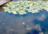 Maintenance: Involves testing, trash removal, chemical treatment, and reporting. Testing mainly involves developing a profile of depth versus temperature and dissolved oxygen weekly. Through this "window" the turnover/stratification of the lake can be monitored, and very importantly, the number of hours to run the pumps kept to a minimum. You see, pumping the water is done for more than human appreciation and irrigation. It is the principal means of keeping the water oxygenated and preventing an obnoxious anaerobic zone from "rising" too far from the lakes bottom. The main intake is a "Tee" bar that comes off the bottom in about the lakes middle some four feet or so up. Without mixing the water by way of pumping, the stinky cooler water on the bottom accumulates and gets sucked into the holes drilled into the upper pipe of the intake. The resultant discharge in the stream is, to put it mildly, an undesirable rotten egg smell. See below for my suggestions on how to improve on all this. Trash removal is done with sturdy "swimming pool" leaf rakes and going hand-to-hand with floating tubs removing plant litter manually. All waste is hauled to a dumpster topside. Chemical treatments are minimal during the wintry colder months. In the summer, algae is periodically sprayed with liquid (for submersed filamentous) and granular (for mats and Chara infestations) copper compounds. For aphid problems, evidenced by many tiny black dots on chlorotic lily pads, Volck oil is mixed with water and sprayed via a hand or back-pack pumper. Suggested Changes: Are not many, but substantial in their effects in money savings and improved appearance. 1) Aeration: The money spent currently on aerating the water by pumping it around could be reduced by about nine-tenths by it's reverse; pumping the air into the water. A compressed air/destratifier would easily pay for itself within a year, reduce the oxidizable nutrient load to noxious weeds, and their proliferation. Such a compressor, storage tank, and its controllers should be mounted in the existing pump vault and a protected, pressurized line brought out parallel to the main pumps' intake line. A "bubbler" either set on the bottom, or within and above a pipe reaching down to the bottom, will lift the low/no oxygen water to the surface for warming and aeration.