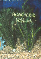 Vallisnerias: Taller, narrower-leaved and generally not as deep green in color as the similar appearing Arrowheads, the genus Vallisneria are land-grass like plants that live entirely aquatic lives. The most appropriate, about only sub-tropical species offered in the trade is "American" or Jungle Val., Vallisneria gigantea. Native to New Guinea and the Philippines, this up-to six foot long beauty is now widespread worldwide; for example, growing year round in ponds in Southern California. Like Sag.s, Val.s are grown in closed containers of soil or gravel with care taken to not crush their sensitive thick, white roots on planting. They similarly reproduce by asexual runners and occasional flowering.