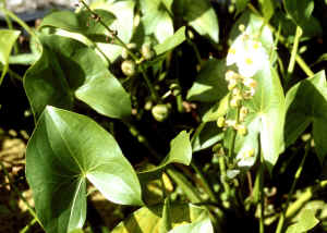 Sagittaria, the Arrowheads: "Sag's" are easily grown in aquarium to bog circumstances. Indeed, Sagittaria tubers have been human food staples in Asia and North America before recorded history. There may be sixty plus species in this genus, some small, others tall, with very different submerged and emergent growth that in turn is variable depending on light and other growing conditions. Aquarium hobbyists may at first be surprised to find that there are larger, growing-out-of-water types of "Sag", but have likely seen these in viewing aquatic gardens. Called Arrowheads for their distinctive pointed emersed leaves, these plants are best rooted in sand covered soil where they will quickly reproduce (in warm seasons) by asexual runners though this family of plants (the Water Plantains, Alismataceae) does indeed reproduce sexually through flowering. Most folks use plastic trays to contain these adventitious plants, but any soil-holding container will do.