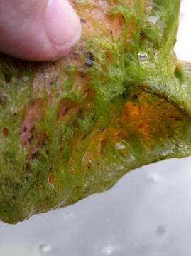I noticed that the water lilies have a green slimy algae-type of growth on