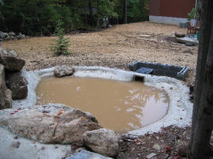 This n' That... Gunite, waterproofing ponds, surrounds... 7/18/08 I am so glad you guys are there. We had a pond Gunited 3 weeks ago, it measures 33' long 22' wide 3+' deep. Around the whole perimeter is a shelf for boulders, rocks, plants, safety shelf. <Mmmm> I do not know of another way to seal this other than plaster, <Does need to be sealed... Gunite is NOT water proof> clear to the top edge, the boulders will set down in the water about 4" on this shelf. What do I seal the top shelf with? <Likely more "cement plaster" with color/oxide...> What about clear Herco rubber? <Not if I were doing it... expensive, not really an appropriate application> After whatever I uses dries I figured mixing mortar or cement to fill in the back of the shelf, <Well... I do wish we were starting from "go" here... but as the shell is already shot out... I would cement plaster (or otherwise... see WWM re... Thoro et al. products) seal the entire basin, including the "bench", then place the rocks (I'd use bits, swatches of "old carpet" to set them on... over the plaster... and seal about these in turn... and behind them a bit, to over the real water level of the berm... I do encourage you to get/use a water level... to assure this> where the void would be, set the boulders that varies 1' to 2' boulders wide on this shelf, mortar in-between the boulders and seal this with the clear Herco? <Mmm, no... won't work, or last> I am also wondering how to leach out the lime in the plaster? <No big deal... easily done over time, or through acid-washing... again see WWM re> No hurry for fish. I have 3 sequence pumps <Ahh! Very good products> pulling water from the 3-3" bottom drains, from the pumps the water is pushed up hill 25 feet away, up 12' to the 3- 15' long 3' wide 2+ feet deep biological filters, <Nice> lave rock, white filter media, brushed, returning down the 12 tall water fall. I have u.v.s for this pond, taking into consideration this pond will be in direct sunlight 6 hours a day. <Do get, record values for pH, alkalinity, perhaps DO and RedOx... and time of day readings were taken> I am also concerned about the water heating up, I am thinking of the plaster (white) coloring <? Don't do this... it won't stay white anyway... do mix some color in with this... even something other than sharp sand... e.g. crushed rock... to make stepping into the basin less treacherous... and to promote useful growth of micro-life there> it with a tint of blue/gray but keeping it on the lighter side. <Nah... again, won't stay this lighter color for any period of time... choose "something more natural"... a brown or tan perhaps> I am also concerned about algae bloom. My initial fill of water will be from filtered water, the water running through solar salt, we live in the country our water from the well has a LOT of iron in it, my neighbor is going to fill this from their system, us being concerned about to much draw on the pump in the well. <Mmm... a bunch to state... but I'd be looking into "bio-amelioration" here... using some, likely floating and "grass" plants to remove a good deal of the ferrous, ongoing available nutrient to the algae, harvesting (removing) this periodically during the sunnier, warmer months> to keep this pond topped off, I will be using a float valve, the water will be coming from our filtered water system, the water running through solar or potassium first. I do need to get the lime out of this plaster, what do you rec for doing this? (vinegar? how much) sealing the top edge of the pond to set the boulders on and topping the pond off with our systems water? thank you very much Judy <These and many more important issues are covered in a general sense in articles, FAQs files archived here: http://wetwebmedia.com/PondSubWebIndex/Pond%20Sub%20Web.htm Learn to/use the search tool (linked on the left shared border) and/or indices. Feel free to write me re specifics. Bob Fenner> Liner with cement installation, reading/using WWM 05/15/08 Dear Crew, I am having a hard time making my choice on how to install the liner and cement bottom of my ponds. My thought is to use diamond lathe <Mmm, no... too sharp... and expensive. See WWM re... I'd use chicken wire or stucco wire...> on top of the liner to strengthen and make the top coat go on easier. I am also not sure of the best method to cap the rim of the pond. <Mmm, see WWM again... the berm needs to be firmly seated... any cap/stone to be chemically inert or out of the water... or of favorable soluble make-up...> I have flagstone I would like to use but am uncertain of the best method of securing the liner under the quartzite flagstones. <... is posted... tie (hog-rings likely) the liner and reinforcing mesh to pencil re-bar that is in turn anchored into the ground...> I live in Maui so low temperatures are not an issue. They are two round ponds approx.11ft. diameter x 2 1/2 ft high each done in stone and concrete. Any suggestions would be greatly appreciated. Many thanks Dave <Read on my brother: http://www.wetwebmedia.com/PondSubWebIndex/Pond%20Sub%20Web.htm a hu'i hou! Bob Fenner> Natural Freshwater Habitat... pond 2/14/08 Good Afternoon, <Yawn! AM here now> I have a question about bottom substrate for a pond I am starting in an 800 gallon contoured concrete pool. I would like to create a healthy sustainable ecosystem stocked with native fish and plants (southwest florida) in as little time as possible. I understand the need for natural bacteria and their processes and had originally hoped the bottom substrate would mostly be comprised of fallen plant matter, <Mmmm> but I don't have that much time to let nature take its course. I believe my choices are between a gravel substrate or dirt bottom and Im curious as to what you might recommend. <Actually neither...> I have a small filter with waterfall feature constantly running in the pond and I would like to keep some clarity. I realize the mud wouldn't necessarily be conducive to that and was wondering if the 