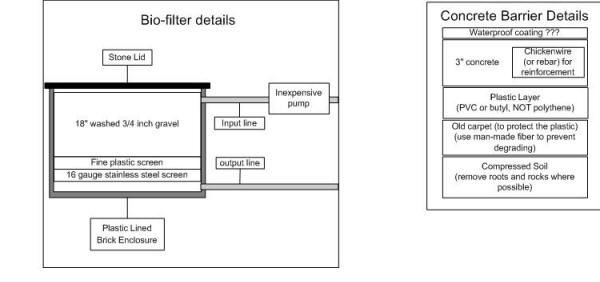 Re: pond advice Thanks for the feedback! I have a couple of follow-up questions and have listed them below, next to your comments: >> I posted an overview of the project > <Ahh, very nice illustrations> Thanks for the kind words. >> 1. how much of a biological filter is needed, since >> I have a waterfall (I heard a waterfall does >> some bio filtering) > <A good ten percent of the volume of your pond > itself, plus. Have you perused my old pond pieces > and the FAQs posted on WWM? I have been through those pages and am going to try and draw a diagram to illustrate how to build the bio filter, to make sure I am getting it right. I will send you a link to the diagram when I finish it to make sure you agree with my interpretation. <I look forward to seeing this> >> 2. what kind of skimmers would catch leaves etc >> but not small fish? > url to --> /PondSubWebIndex/pdplumbing.htm I have read through that page and found the plumbing info very useful but didn't see much if anything about skimmers on it. <Most folks use (and often modify) swimming pool, spa skimmers... with a berm or a bit of wire mesh to prevent fishes from getting swept over and into them> >> 3. any feedback on my diagrams or plans in general >> would be most appreciated. > <I would definitely leave out the newspaper layer in > your shell construction... I agree with that. Another member responded to my forum post and said that as well, but also added that carpet was a bad thing for padding a liner because it would rot and leave a gap, possibly then allowing the concrete to crack. <Mmm, not likely... but most folks do dispense with carpet or other underlayments unless the area has a good deal of sharp rock, protruding roots that might puncture the liner... the purpose is to protect the liner itself> I had heard (from this site and others) that carpet did NOT degrade which was why it was good to use. Can you confirm if carpet is good? <Is useful in some circumstances, rarely harmful> > and use a PVC, butyl... not polythene liner... On your website, you state that --> " 'Poly' liners can be used effectively as concrete underliners"... <Am sorry for the confusion... Poly refers to PolyVinylChloride... PVC, or other PolyVinyl that is flexible and far more permanent than Polyethylene... aka Greenhouse plastic...> I am assuming that an reasonably thick plastic liner would work as an "under concrete" liner, since there would be no walking on the liner (reduced chance of puncture) + no sunlight contact (to degrade it). <Actually no... though sun et al. does more rapidly degrade polyethylene, it does degrade too quickly, even underground> I was planning on spending most of my $ on plumbing, pumps and concrete, rather than an expensive liner... your thoughts are appreciate here though if I am getting ready to make a mistake on the type of liner. <A decent liner should cost you no more than about a dollar a square foot... much less per unit if the pond is very big> > <And to make a statement re: JasonC and I are > (finally) going to crank out a water feature > book/title... hopefully with as nice of graphics as > you've presented here. Bob Fenner> That sounds great, I cant wait to see it! If I can help with your diagrams, let me know :) <Outstanding. Thank you for your offer. Am going to CC Jason here... am mailing him twenty pounds of the materials for the book today. Bob Fenner> East Bay Pond Help Hello, <Hi, MikeD here, standing in for Robert> I am looking for someone to help me with a pond in the yard of a home I will be renting in the next couple of weeks. The home is in the East Bay area.<In the East Bay area of what city?> Do you have any contacts? <As we have an East Bay area here in Clearwater, FL, my first response was to say of course, before I realized that there are "East Bays" located everywhere!**grin** Checking your local yellow pages for pond maintenance, pond supply, etc. ought to yield good results. If by some extreme circumstance you ARE referring to this area, check Pet's Unlimited on Drew St. as they've been specializing in that area longer than anyone I know> Thank You Koi Pond - Do I need a pump? Dear WetWebMedia crew: <Hi there Brad> I am a reef aquarist who has lived in apartments my whole life. I wanted a Koi pond, so I bought a house (ok, there were other motives too). <I'll bet!> WetWebMedia has lots of good info, but: Do I need a pump? I would never consider setting up an aquarium without one, but most articles seem to connect having a pump to having a waterfall or fountain. I don't want visible moving water, but I don't want a dead/dying/stagnant pond either. <Almost assuredly yes... you will need/want to circulate, aerate AND filter your system> WetWebMedia (and other sources) always mentions a drain at the bottom of the pond. For those of us on level ground, where should the other end of the drain go? <To waste> The bottom of the pond will be lower than anything else. Do I need to put water up and out of the pond if I drain it? <If you have no drain, yes> Thanks, Brad Bellomo <Do look into all of these issues more... make a check-list and draw up plans for your pond now, not later. Investigate your pump options... and get one that won't run you into the poor house...they can be costly to operate in the long haul... and need to run 24/7. Bob Fenner> Re: B&B <Mark, are the folks moving ahead with the water feature project? About where are they at this point? Excavating? Trenching for conduits, plumbing? Will look later today for info. on filter containers, ozonizers. Bob Fenner> Bob, I think they're working on pump sizing, etc., the tour of the existing places went well, now they're thinking biological again, but bob still wants crystal clear water too. So, still planning stage right now. I have to wait a week or so to get the well tested, the power is off right now due to building construction. I'll know more when Jim gets back next Wed. Thanks, Mark <Real good. Appreciate this. Bob Fenner> Fish Ponds in