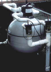 Most water features, with life in them or not, require some form of filtration to maintain or improve water quality. Filter modes run the full gamut of simple particulate strainers intended to keep solids out of the pump, to computer-monitored systems with meters and dosers. This is a brief overview describing modes of filtration for waterscapes. You will find there is a plethora of various, sometimes conflicting opinions regarding the best available, most appropriate mode for a given application. Unfortunately, to my knowledge, there are no comprehensive reference works that could provide you with one source of state of the art information. In my opinion you should do your bst to educate yourself as to the choices that make most sense. This is best done, surprise (!) by reading such works as the one in your hands'¦ but there are many more. Outside of books, there are many other sources of information (magazines, the Internet) that promote various manufacturers' wares, and perspectives. Depending on whether the system at hand is intended to be sterile or biological; balanced with plant and animal life and no circulation; have influent water from determinant source(s); be indoors or out; be crystal clear or tolerably murky; ad seeming nauseum, there are a spectrum of biological, physical/mechanical, chemical filters to consider. If it seems the best I can do is commiserate with you over the state of affairs in our industry at present, be aware; I intend to do much more. The following Sections will give you a firm beginning as to the theory and current best practices for maintaining your system in the way of filter design, construction and maintenance. For biological systems this will be a concise guide to options per all given sets of circumstances. Do not despair at the disparate and conflicting opinions regarding filtration amongst writers, retailers, contractors and hobbyists. Remember, a great deal of water gardening is art as well as science; keep in mind this difference when appraising the anecdotal information you come across.