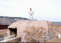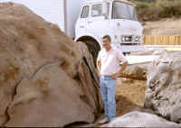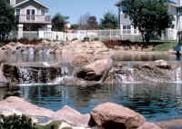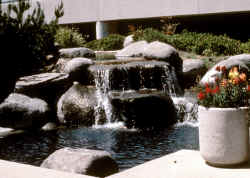 A rock is a rock is a rock; or is it? The answer is no; many types of rock are unsuitable for waterscape use. Some are too soft and gradually dissolve away; many types are chemically toxic to pond life. All rocks are a danger to you, the aqua-scaper, whether they're sharp or not. Their massiveness and lack of handy handles poses a danger in lifting and placement. Happily there are specialized tools and folks who know how to use them for moving rocks of hundreds or thousands of pounds. What would a water effect be without accompanying waterscaping rocks et al? Plain. The beauty in arrangement of rock and other decor items is a matter of personal taste; I'll give you some suggestions on how to improve yours. Material Selection: Sources/Considerations There are two ways to go about aquascaping your aquatic garden; either focus on 1) what materials are readily available, or 2) start with an absolute dream of the size, type, color, texture qualities of the decor you'd like and then set out to acquire or fabricate it. Did you ever see the movie "The God's Must Be Crazy"? One of the most amazing revelations to me from that show was that there are areas where there are no rocks to be had. Do you live someplace where the hardest object is a coke bottle? Well, fear not; there are always artificial rocks to be had or made. Faux Rocks: come in several formats easily defined on their manner of construction and composition. The simplest for the home user/contractor are pre-made CRF's, concrete-reinforced fiberglass (photograph). These are light-weight, naturalistic and quite tough if not physically abused. See the references for water garden, your local rock and gravel (nursery) businesses for sources of phony rocks. You can also make your own or have someone skilled do it for you. The most primitive technologies for these ersatz rockworks involve making a "cage" of tied (or welded) steel rebar, covered by wire, metal lathe (be careful) and/or canvas bags. Cementatious material is applied to this; mortar by hand for small jobs, gunite, shotcrete, mortar mix by pumper/sprayer for big ones, and worked with hand tools for cut-in and texture. A color finish and additional texturing are added with spray oxides, brushes and possibly the zenith of artificial rockworking.
