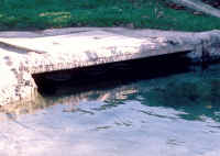 Operation: Livestock: There are intentionally no living organisms in this system. No fishes, plants, birds, nada. In the absence of insect eating life, sufficient chemical residue must be maintained to destroy mosquitoes and other pests. Maintenance: Weekly water testing and adding of sanitizer (chlorine), and possibly stabilizer (cyanuric acid) are about all the chemicals used. In Southern California our "liquid rock" water has sufficient mineral concentration such that we rarely have to bother with diminished alkaline reserve (no buffers added here). A swimming pool genre "leaf rake" net for cleaning out debris, the vacuuming mentioned above and cleaning of skimmer is about it. Make-up water is supplied through an automatic float valve. Suggested Changes: Actually only one; to keep an eye on and if necessary improve on the drainage between the basin and the surrounding landscape. Provision needs to be made that dirt et al. not wash into the water. Trenching, French or other drain type will prevent this. Otherwise, this feature adequately does what it is intended to do; produce soothing sights and sounds, masking out nearby street and freeway noise. If it had been intended as a biological system, more sharply sloped sides, greater depth, and an alternate pumping and filtration schema would be required. As it is, this is a gorgeous, functional, purely ornamental effect. A second, minor concern, or note I have is to the folks doing the chemical additions. If you intend to continue using solid oxidizers, take note of the damage occurring to the concrete as a consequence. I encourage you to fit or buy a simple feeder for your tablets, and not simply toss them in the waterfall basin where they are digesting the bottoms concrete, exposing wire mesh. Close: This system gets high marks in all respects; design, construction, and operation. It might not be what you or I consider a beautiful pond, because it is bereft of life and has a high electrical bill to go with all the waterfall splash, but it is doing what it was designed to do. Bibliography/Further Reading: Fenner, Bob & Rick Aspray 1983. Ornamental fish ponds. Filters: design, construction and maintenance. FAMA 6/83. Fenner, Bob 1988. Water Effects: size and shape. FAMA 5/88. Fenner, Bob & Matt Tsunoda 1988. Waterfall construction. FAMA 11/88. Fenner, Bob 1988. Aquatic Gardens: Plumbing. FAMA 12/88. Fenner, Bob 1989. Pumps: An introduction. FAMA 1/89. Fenner, Bob 1990. Upflow filters (for biological ponds and multi-tank systems). FAMA 2/90. Fenner, Bob 1990. Pond construction: (Processes in) Building concrete and liner (production) ponds. FAMA 9/90. Fenner, Bob 1991. Thorosealing cementatious water features. FAMA 5/91. Fenner, Bob 1994. Pond construction methods. FAMA 5/94. Fenner, Bob 1994. Concrete and block construction of ponds. FAMA 6/94. Fenner, Bob 1994. Filter media for ponds: A discussion. FAMA 8/94. Fenner, Bob 1993. Electricity and electrical use around water gardens. FAMA 12/93. Fenner, Bob 1994. In-pond (versus outside) filtration. FAMA 9/94. Fenner, Bob 1995. Selecting a site for your outdoor water feature. FAMA 5/95. Fenner, Bob 1996. Plants and planting for water gardens. FAMA 6/96. Fenner, Bob 1996. Surrounding landscape plants for your aquatic garden. FAMA 9/96. Fenner, Robert M. 1997. Aquatic Gardens; Designing, building & stocking a backyard pond. Microcosm, VT. Graphics Notes: A view of the system with its prominent waterfall of grey granite boulders. Some of these rocks weigh more than your car. A detail of the basins edge. Note the problem of the landscape being higher than the berm. This leads to solids and fertilizer washing into the water; directly exacerbating poor water quality conditions. The only "filter" to this system is the jerry-built modified skimmer emplaced to keep large solids like leaves and logs out of the pump. Swimming pool "skimmer baskets" have been placed on top of the original grating to facilitate smaller solids removal.