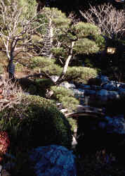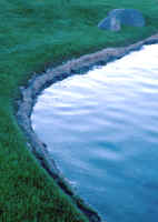 Construction: This is an archetypal "production" pond of waterproof liner over dirt, chicken wire tied to a berm support of staked-up rebar, shot-creted with six sack mix and brownish coloring. The "knockdown is purposely rough, with the edge patted with tow-bys of wood and the bottom only cursorily bull-floated. This isn't just laziness; a rough finish provides good footing for human workers and accidental fall-ins. The bottom does slope to a definite "mid-drain" about in the middle of the basin in front of the fall. There is an alternate intake to the pump located at its bottom which meets up in the skimmer and collectively flows back to the pump. This 7.5HP unit is located adjacent, sub-grade in a concrete vault. The waterfall construction is a paradigm of excellence; an example of how to do these things right. A substantial base of concrete and block was cast such as a building foundation to support the upper basin, and the pond liner was fitted as one piece, continuous with the upper, lower basins and waterfall face. Rocks were placed and mortared over the liner such that the water is always contained over the waterproof membrane.