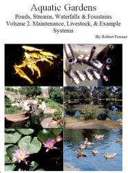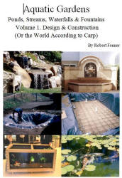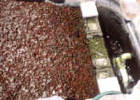 Rather than a specific type of filtration, as the name implies, upflow refers to the path of water through a particular filter media. This direction is often contrasted with "gravity", "natural" or "top to bottom" flow. This article describes the benefits, design, construction and utilization of upflow filters and offers specifications and instructions for a production model our old corporation used to manufacture and distribute. Optimized reverse or upflow path filters incorporate the follow design pro forma: a suitable chemically-inert container of correct size and shape, remoted from the main holding system (as opposed to "In-Pond" filters) for ease of operation and maintenance. For biological ponds and multi-tank systems these filters cost less to fabricate, install and operate and are more efficient per dollar in terms of electrical, labor and down-time costs than any other filter-type. (a more definitive, persuasive argument for these filters is offered in the last article in this series.) Biological Filters in General: Have two sets of specific purposes: 1) Functionally they provide sufficient habitat, oxygen and nutrient via circulation for conversion of metabolites- ammonia, nitrites, albumen, and other dissolved organic compounds (DOC's) to less noxious chemicals by beneficial bacteria and other microbes. 2) Aesthetically: they help keep the system "clean", clearer by limiting nutrient availability to algae and micro-organisms in other parts of the system. To some extent, they accomplish these ends by trapping particles like mechanical filters. Depending on media type, surface area, flow rates, and characteristics of the water, they also act as chemical filters in some ways. Biological filters are best understood as living entities, affecting and being affected by the rest of the environment. Bio-filters accomplish these feats by having enough, but not too much flow of the system's water pass through proper sized and placed media where aerobic and anaerobic microbes work on it. The products and by-products of their metabolism are dissipated as gases and absorbed by physical, chemical and biological processes and diluted by frequent partial water change. Some folks aid and abet these processes with ultra-violet sterilizers, protein skimmers, and/or chemical filtrants... for the most part these are expensive and unnecessary when the rest of the system is designed and built properly, provided with adequate circulation and filtration, and not thrown out of whack by over-population, feeding or fertilization. Circulation path and rates are important as it is intended that solids and free-floating algae be trapped in the filter media, and not vigorously "pushed" through the media without due processing. Empirically, the rule of thumb value is two to four gallons per minute flow per each square- and/or cubic-foot of a given type of filter media. Other contributing factors aiding or detracting from a system's intended function(s) will be discussed in other Sections in this book in terms of design, construction and maintenance. Some examples are the effects of lighting/shading, appropriate foods and feeding, adequate depth, size, shape and dark color of basins. Placement Of The Filter: May be either above or below ground level, depending on whether you desire to pump the water to the filter or from the filter after it has been fed by gravity-overflow from your system. I urge you to engineer your filter system above grade due to the following advantages: 1) The ability to hide or disguise the filter(s) behind falls, landscape, etc. 2) Ease of backwash and other manipulation as necessary. 3) Not having to rely on transit volume to keep your filter filled with enough water. Construction: The Filter Container Should be as large as possible; at least ten percent of the volume of the rest of the system. Many folks use multiples of less expensive smaller containers hooked up in series and/or parallel, rather than building or buying just one large filter sump. The shape of the filter sump(s) is important as well; they must be deep enough to provide adequate space for 1) sedimentation of solid wastes on their bottom 2) usually twelve to eighteen inches of media depth and 3) overflow. See illustration. Filter construction, as the rest of the feature should be made of chemically unreactive materials. Ours were made of polyethylene, the same plastic used in wrapping food (ours came from soda concentrate shippers). This compound is heat, cold and jar-resistant, and will not rot, crack, or delaminate like fiberglass and polyurethane resins. Filter basins can be made from part of a multi-tiered system as detailed in the last Section; or made like a pond itself with block, cast concrete with or without a liner, sealed with a cementatious coating. These are typically more time and money consuming and less serviceable than plastic drums. Plumbing: The filter system is fitted with lines as depicted below in specifications. Various guidelines are presented for plumbing water features in a later piece. To re-cap: The intake from the system should be screened to keep large "gunk" (a scientific term) out of the pump and biofilter. This water should be drawn from the mid-water with some possibly skimmed from the surface. The filtered water is best returned to the system at an opposite end, being agitated (e.g. by a waterfall) to aid in de-gassing. The discharge line from the pump to the biofilters aeration tower should be arranged to maximize mixing of air with the water. Some people fit their towers with "wet-dry", "reef" media used in saltwater aquariums. The overflow and drain lines should be as large as possible. We provided one and one-half inch on our production models. The intake line should be no larger in diameter than the discharge plumbing size from the pump. Which brings us to... Pumps And pumping. As I stated in the Pumps artilce, these bare careful consideration in terms of section and engineering