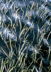 Amongst the most hardy and undemanding aquatic plants, Vallisnerias are easily grown in most aquariums. Their easy requirements are nutrient bearing gravel, lots of light and careful initial planting (with their white crown bases barely above gravel. Val.s are great for backgrounds, tank sides and central areas where high relief is desired. The genus is probably the most widely offered in the hobby; and the lowest cost to purchase and cultivate. Don't worry about killing them off, you will probably have to periodically thin out these plants to reduce their dense thickets. Distribution & Classification The genus is widely distributed over a large part of the globe, fresh to brackish, tropics to semi-temperate, naturally and through human introduction. Vallisneriaare members of the monocotyledon family Hydrocharitaceae. This group that should be familiar to aquatic horticulturists as it also contains other important genera; Elodea (Anacharis), the beautiful heart-shaped Limnobium and notorious Hydrilla verticillata, among others. The Vallisnerias are superficially similar to the equally popular and appropriate arrowheads, genus Sagittaria. These look-alikes have pointier leaves, whiter, thicker roots and different venation in their leaf structure. Sag's typically bear darker green, stiffer leaves than Val.s. There are about ten species of Vallisnerias, but good luck sorting them out. There is much confusion in the trade and literature on the common and scientific naming of these species and their hybrids and sport mutations. But as William Shakespeare wrote, "what's in a name"? Don't let labels dissuade you from trying the Val.s; they're all good. The Players: Vallisneria spiralis Linnaeus is the beginning of the 'name game' trouble. This plant is named for the long spiraling stalk of its female flowers, but among its many synonyms and cultivar varieties are many surprisingly different structural types. V. spiralis has one sub-form, termed "forma tortafolia", a sport mutation labeled V. tortissima and other 'contortionist' races that are variously sold as "spiral, corkscrew, twisted..." Val in the trade. The common names for the "parent" species include "tape grass" and "straight Val". Does this seem confused? You bet. There are many sports worldwide that have been named for variations in their leaves; Vallisneria spiralis forma portugalensis, V. s. forma nana, V. s. forma pusilla, V. s. forma gracilis. And the fun doesn't stop there; synonyms (invalid same species names) Vallisneria americana, V. jaquinii, V. linnei, V. minor are only the beginning of misnomers (see Roe). I'll never complain about African cichlids again. V. spiralisplants can be distinguished from other Val.s and Sagittarias on the basis of the 'veins' in their leaves. They have five "ribs" which end parallel at the leaf tip. The middle vein is flanked by one thick and one thin vein near the leaf edge.
