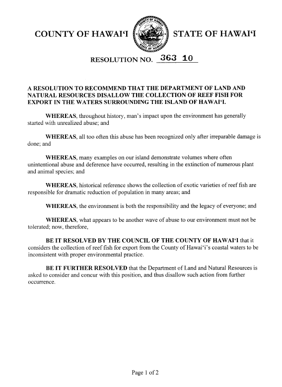Resolution 363-10 "Ban on Reef Fish Collection on