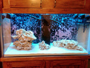 65g tank with 110lbs LR, and roughly 80 lbs sand/crushed coral (chunky