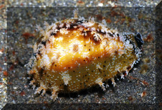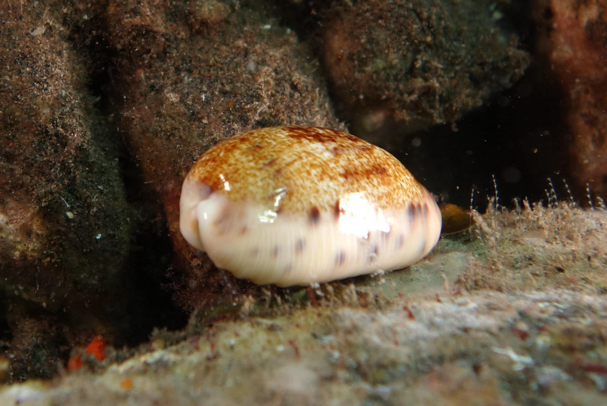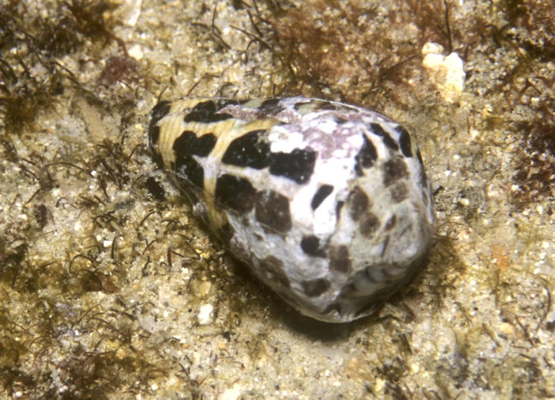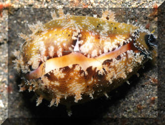 Erronea onyx (Linnaeus 1758), the Onyx Cowry. To 1.5". Indian Ocean and W. Pacific. This one in N. Sulawesi.
