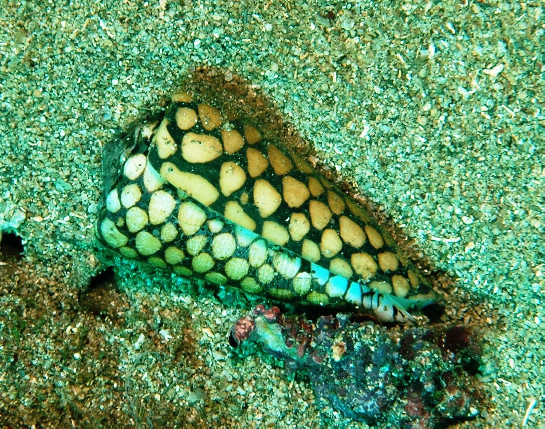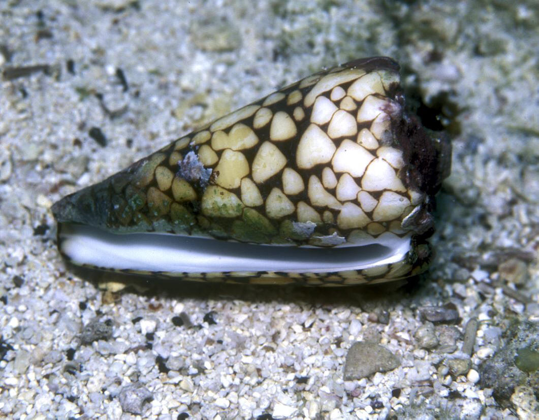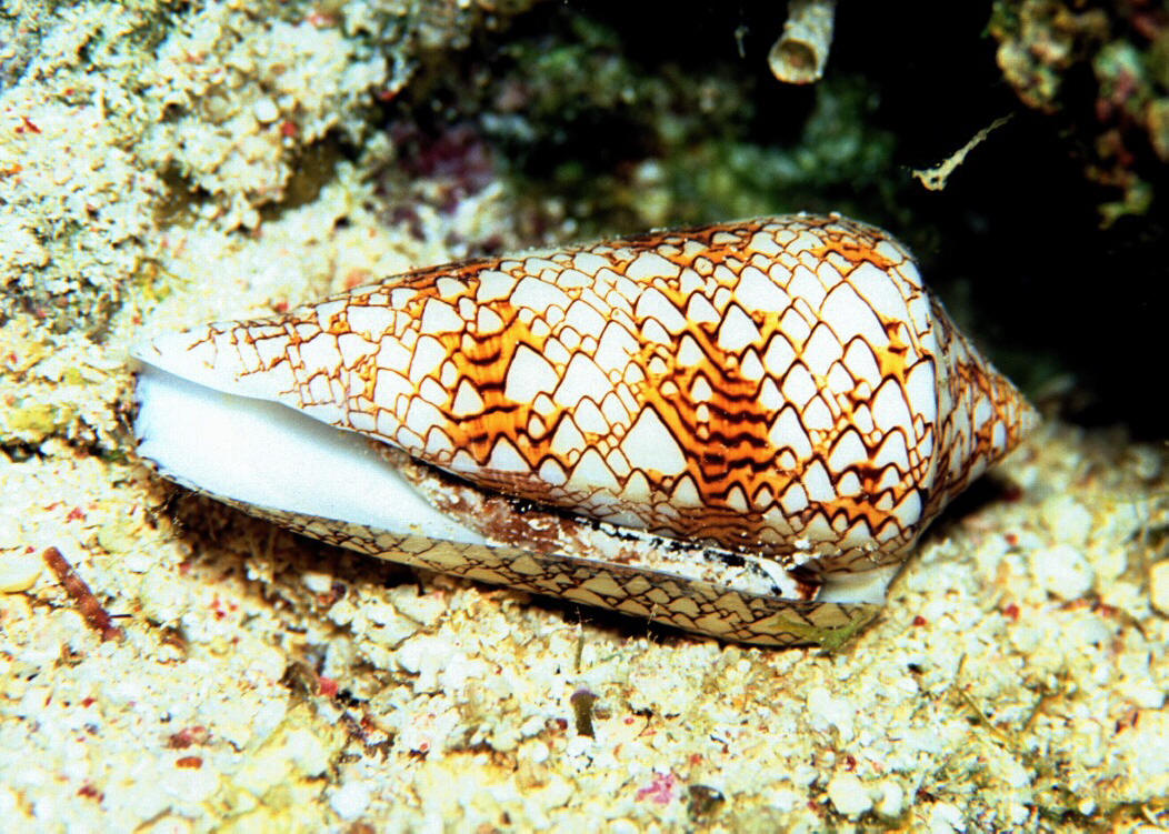 Conus textile Linnaeus 1758, the Textile Cone. Indo-Pacific; Red Sea, much of the rest of the tropical Indo-Pac, including Hawai'i. Feeds on other prosobranch snails. Can be fatal to humans. Red Sea image.