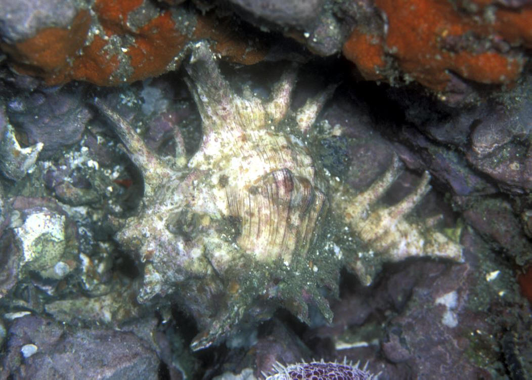 Murex ramosa Images of a live specimen and a cluster of eggs in Nuka Hiva, Marquesas, Polynesia.
