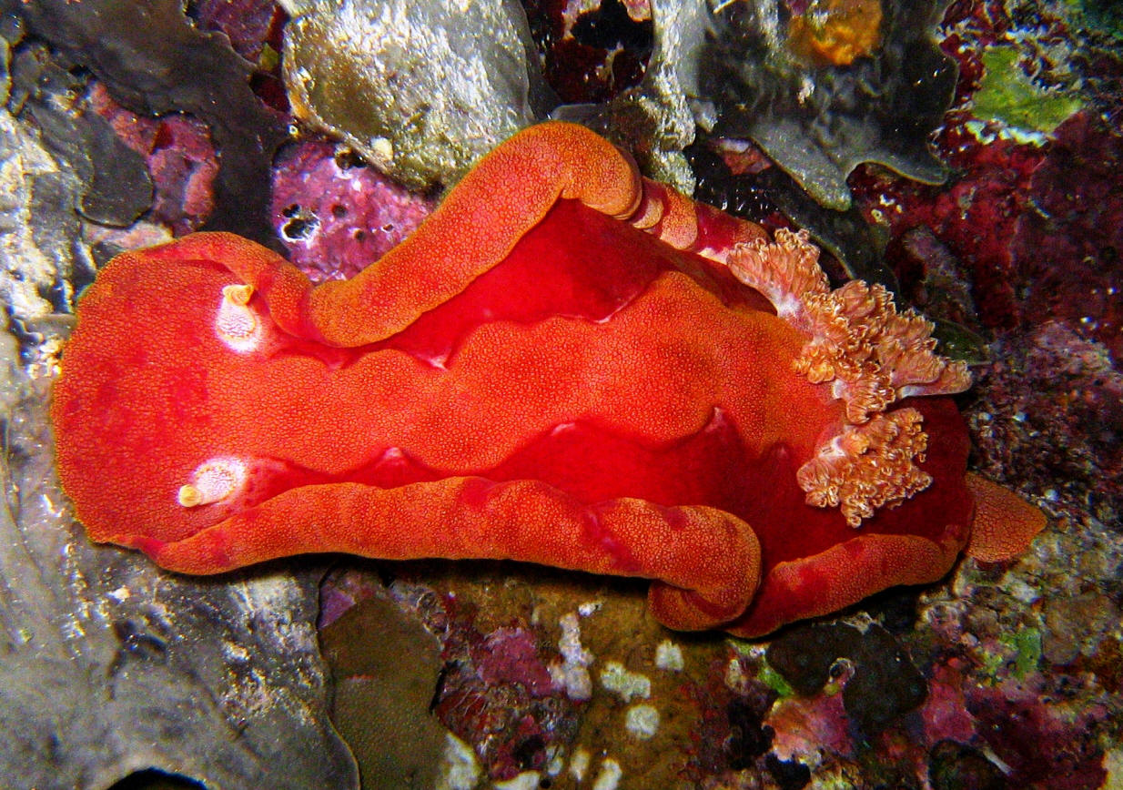 Hexabranchus sanguineus (Ruppel & Leuckart 1828), the Spanish Dancer. Large animal with a prominent mantle. A notable swimmer when frightened. Laminar rhinophores. Partially retractable second gills. Oral tentacles large, flap-like. Red Sea, Indo-Pacific, including Hawaii, Atlantic. Eats sponges, worms, slugs and echinoderms in the wild. Pic by friend Phil Sokol in PNG.