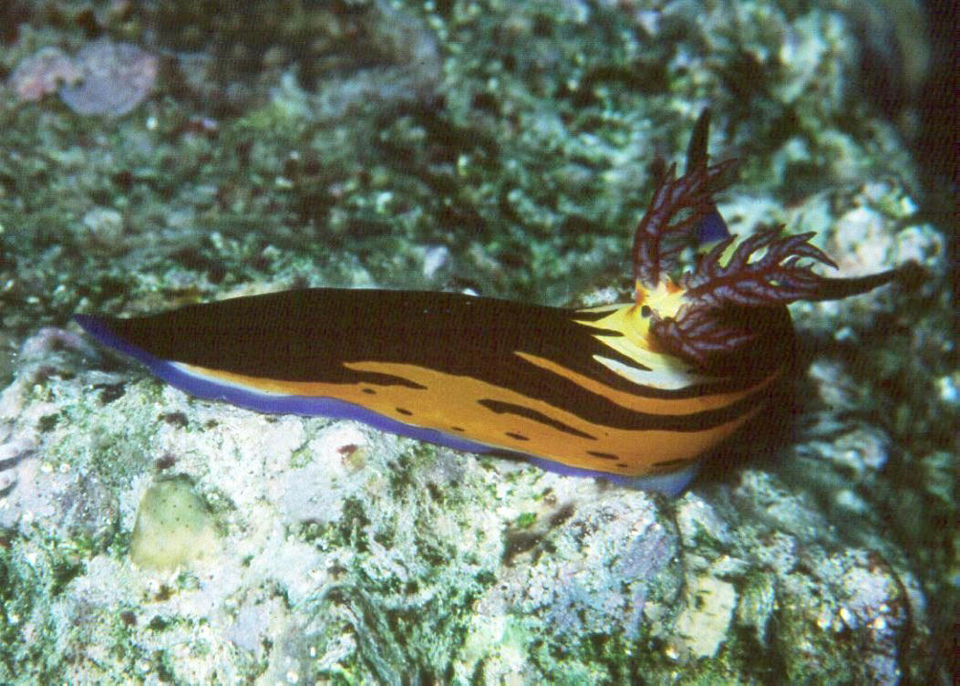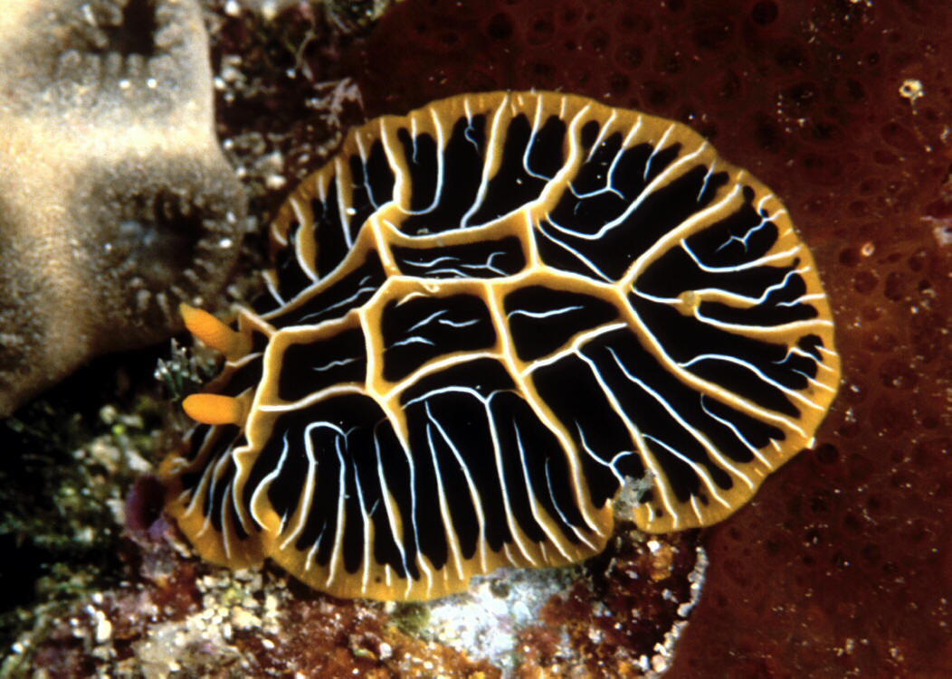 Reticulidia halgerda Brunckhorst & Burn 1990. Black body, raised orange ridges with white borders are distinctive. Similar to Halgerda spp., but lack the circum-anal gills of the latter. Fiji image.