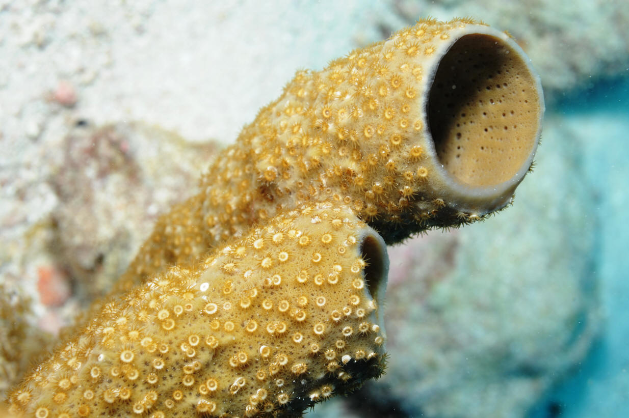 Zoanthid, at right on a Niphates digitalis, the Pink Vase