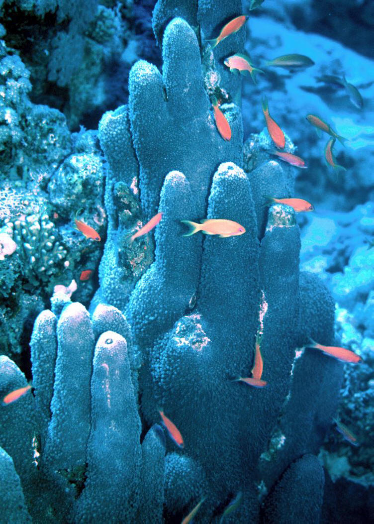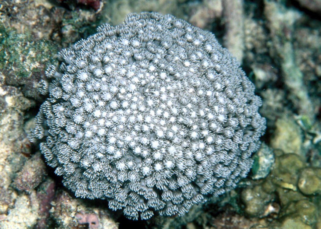 Alveopora daedalea (Forsskal 1775). Colonies as thick plates or columns (up to a meter tall). Corallites with alternating short, long septa. Tentacles appear squared off, six each tall, short in number. Red Sea image.