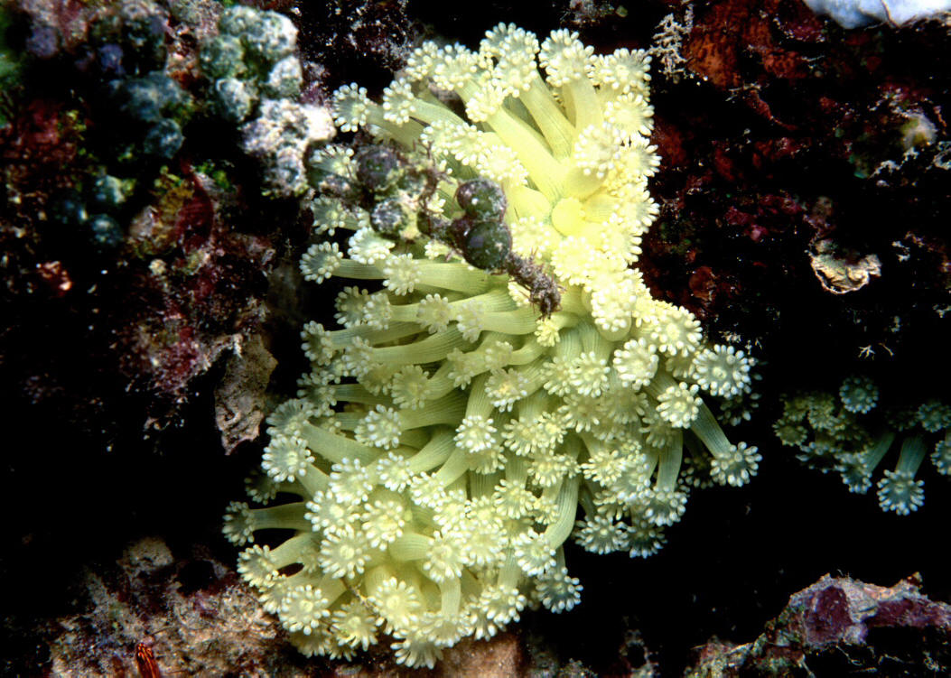 Goniopora lobata Milne-Edwards and Haime 1860. Colonies as columns with growth. Large (more than 5mm.) corallites with small columellae and oral cones; elongate in appearance on full extension. Tentacles and oral cones typically white in color; contrasting with polyps which are otherwise brown, tan or green. Queensland, Austr.,
