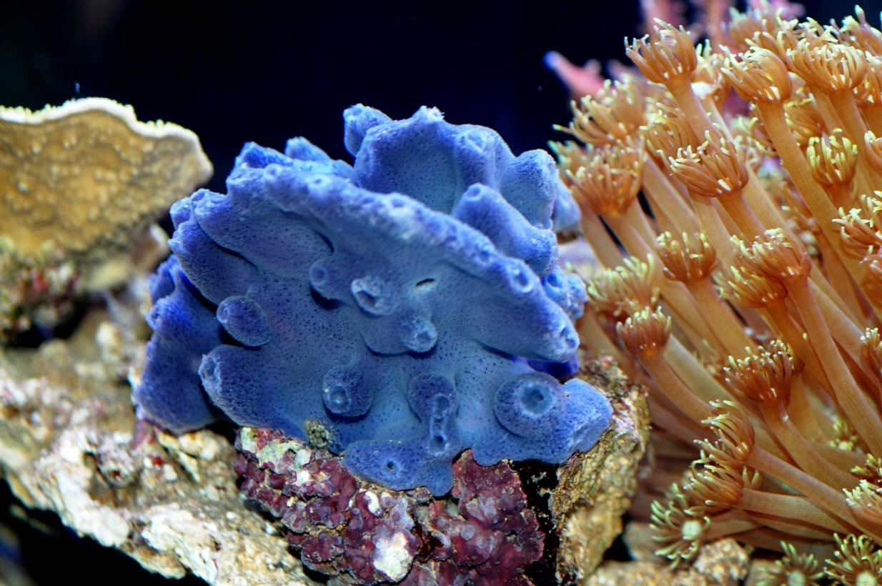 Out of the Indo-Pacific several warm colored Sponge genera/species are collected for the trade; my choice picks are the beautiful blue, yellow or purple Halichondria and Haliclona (shown). These two genera comprise hardy (1's), hermatypic finger and encrusting species requiring intense light. Interzoo 08