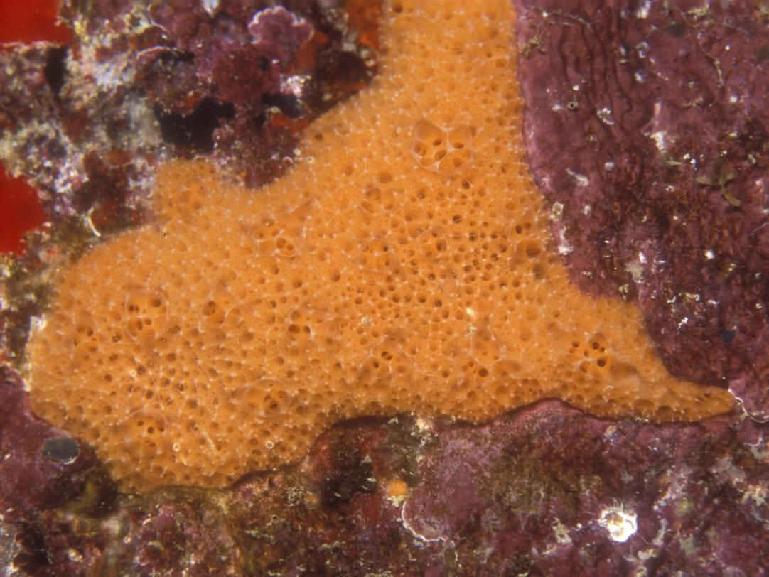 Ulosa ruetzleri, the Orange Lumpy Encrusting Sponge. Up to a foot across. Found mostly about dead corals and Mangrove roots. TiffB pic in Curacao.