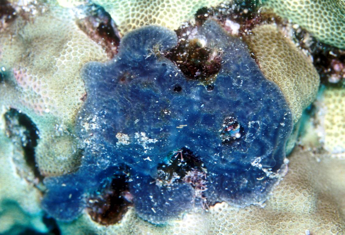 Suberites sp., Blue Suberites Sponge. Intensely blue, as thin sheets. Occurs in high surge areas. Colonies in crevices are a few inches across. Kona pix.