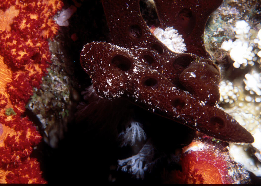 Stylinos sp., Orange Stylinos Sponge. Rough cellulose appearance. Soft material that is easily torn, but don't touch. This sponge will stain and irritate skin. Only a few inches across. Kona pix.