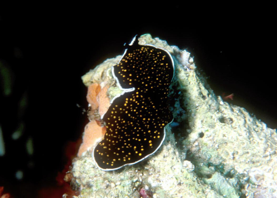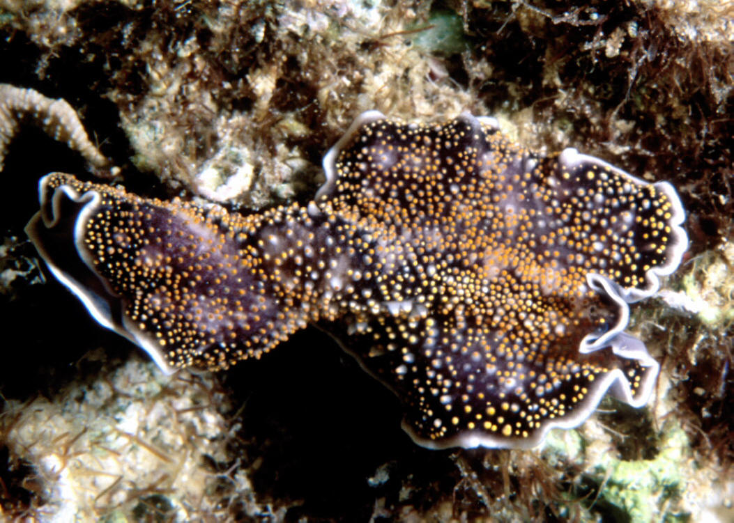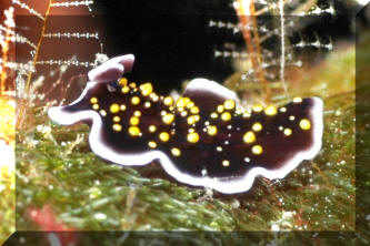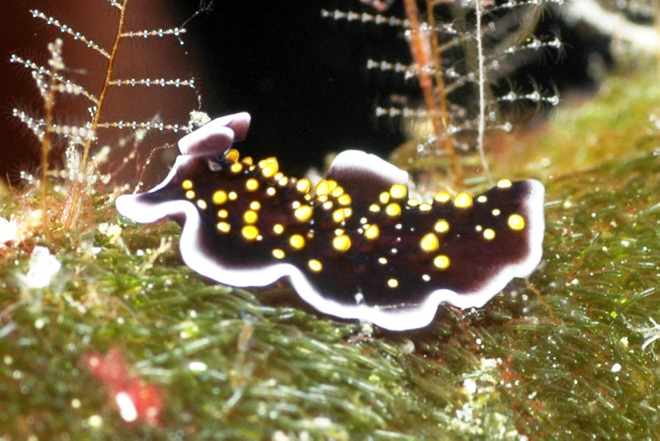 Thysanozoon nigropapillosum (Hyman 1969). Dorsal surface black with short papillae tipped with yellow. White band around edge. Mid Indian Ocean east to Western Pacific. Photo taken off Pulau Redang, Malaysia.