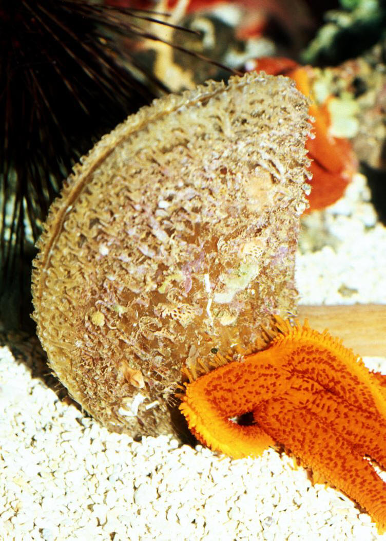 Atlantic Thorny Oyster. Caribbean. Deep red, rounded shell to six inches across. Here off