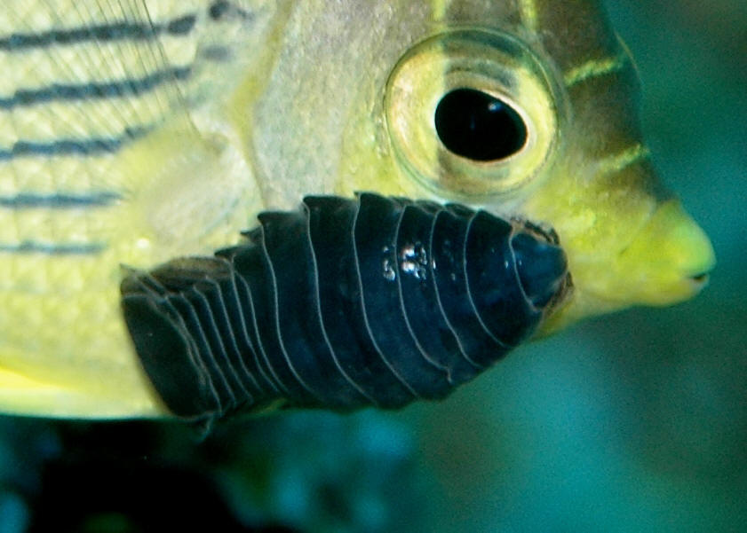 Anilocra laticaudata an isopod parasite of fishes. Here on a butterflyfish host in Grand Turks, in the tropical West Atlantic.