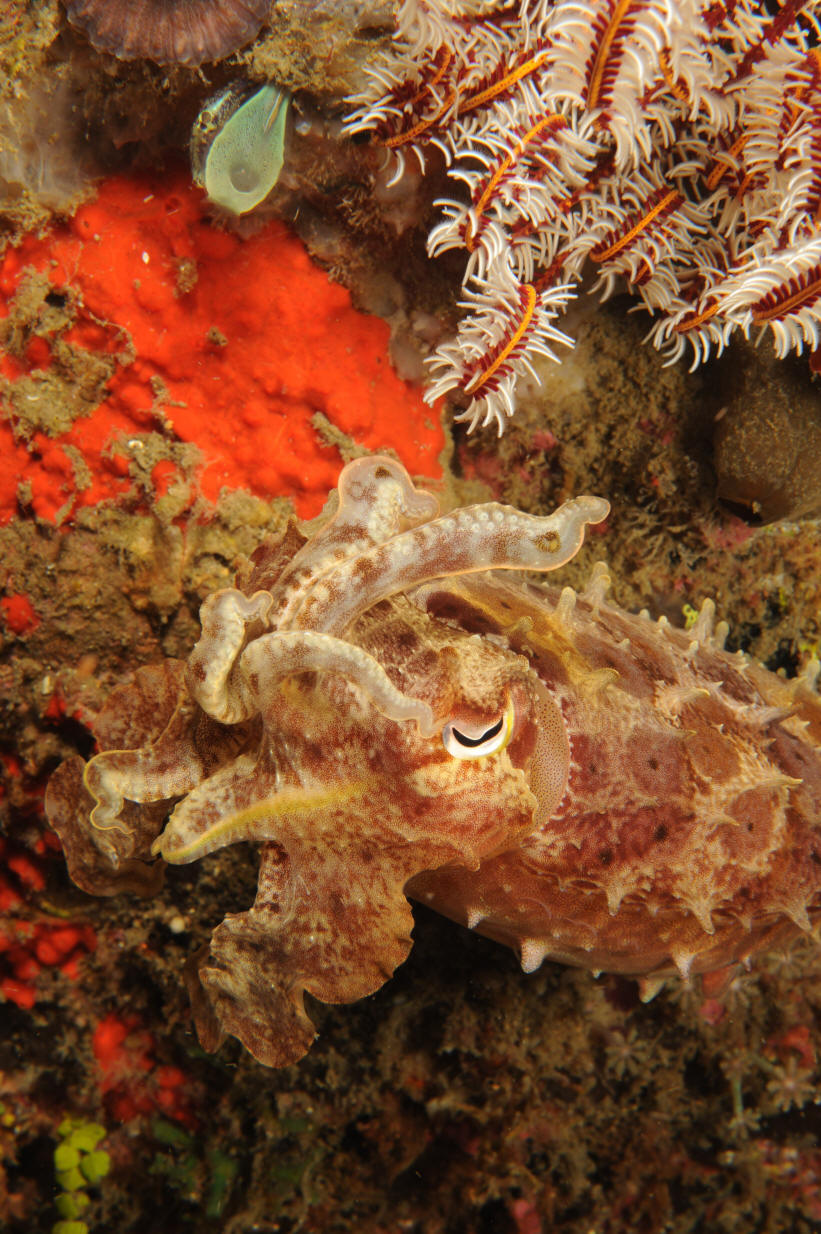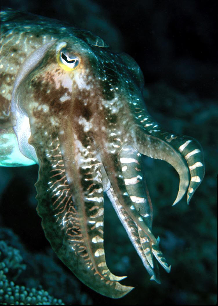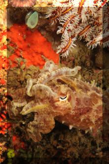 Sepia pharaonis Ehrenberg 1831, Pharaoh Cuttlefish. Red Sea, entire Indo-Pacific. To about eighteen inches in length. Keep solitarily. Lives 2-3 years. This friendly one twixt the Gilis up north of Lombok, Indo.