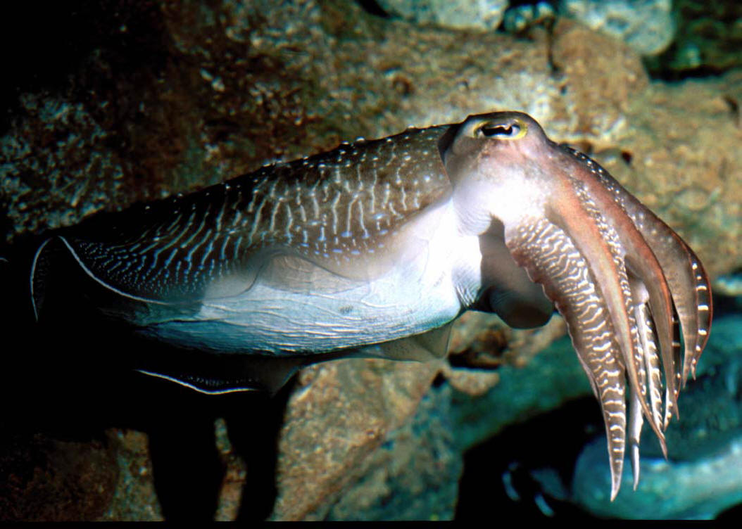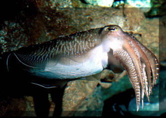 Sepia pharaonis Ehrenberg 1831, Pharaoh Cuttlefish. Red Sea, entire Indo-Pacific. To about eighteen inches in length. Keep solitarily. Lives 2-3 years. This one at the Sentosa Aquarium, Singapore.
