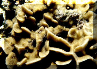 of irregular massive shapes. Corallites 11-13 mm in diameter. Yellow-tan to