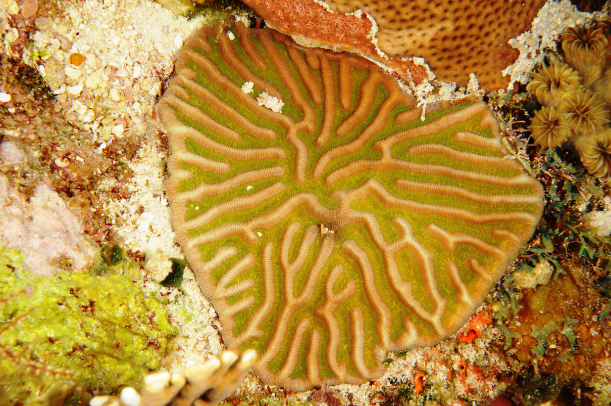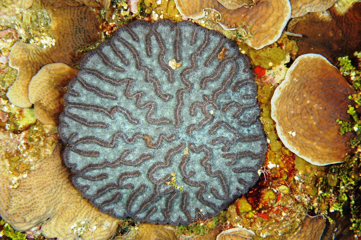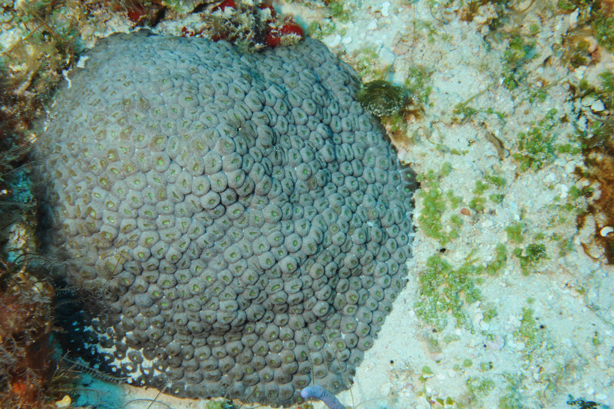 Coral. Colonies as flat plates, mounds, domes. Ridges about edge