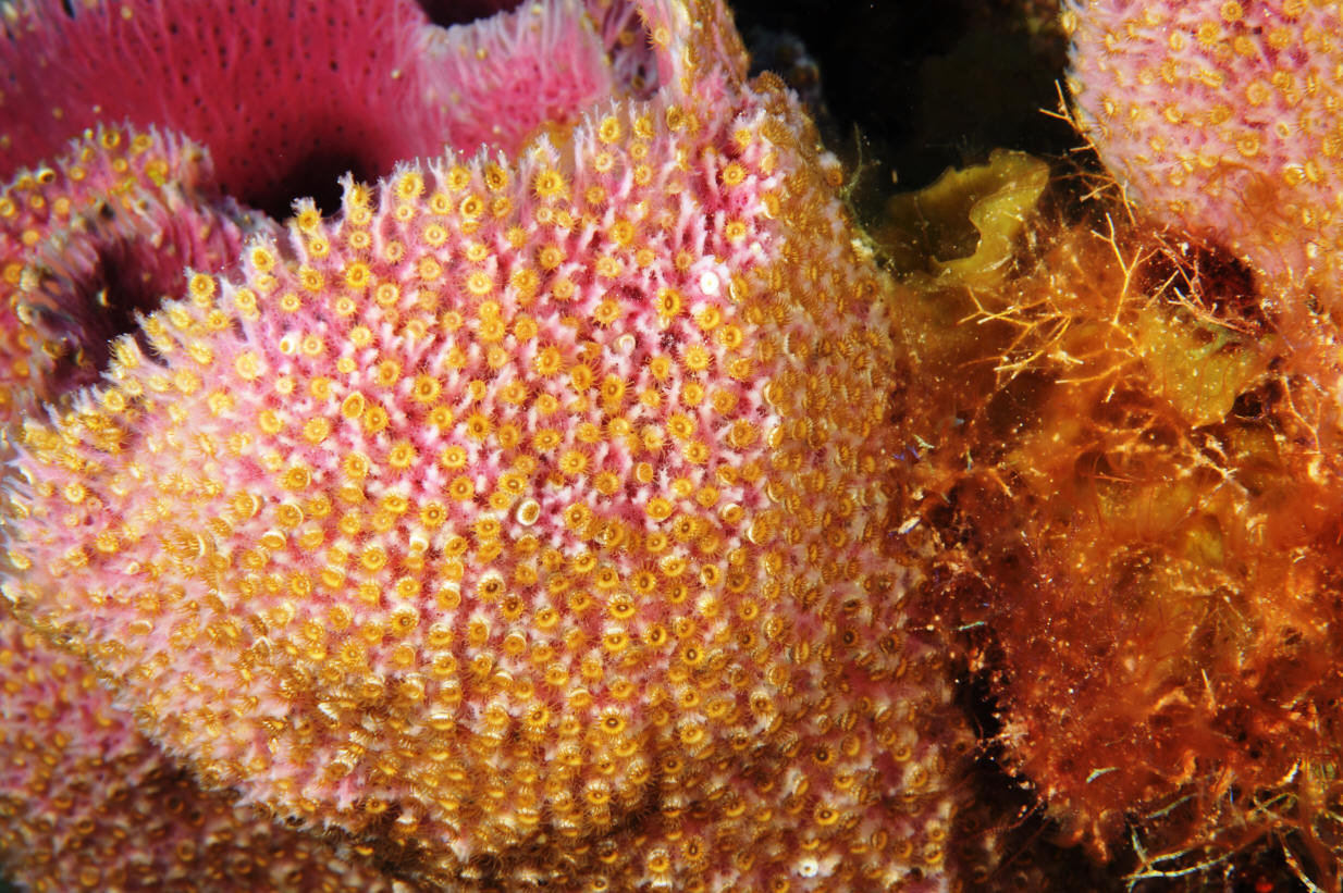 Zoanthid, at right on a Niphates digitalis, the Pink Vase