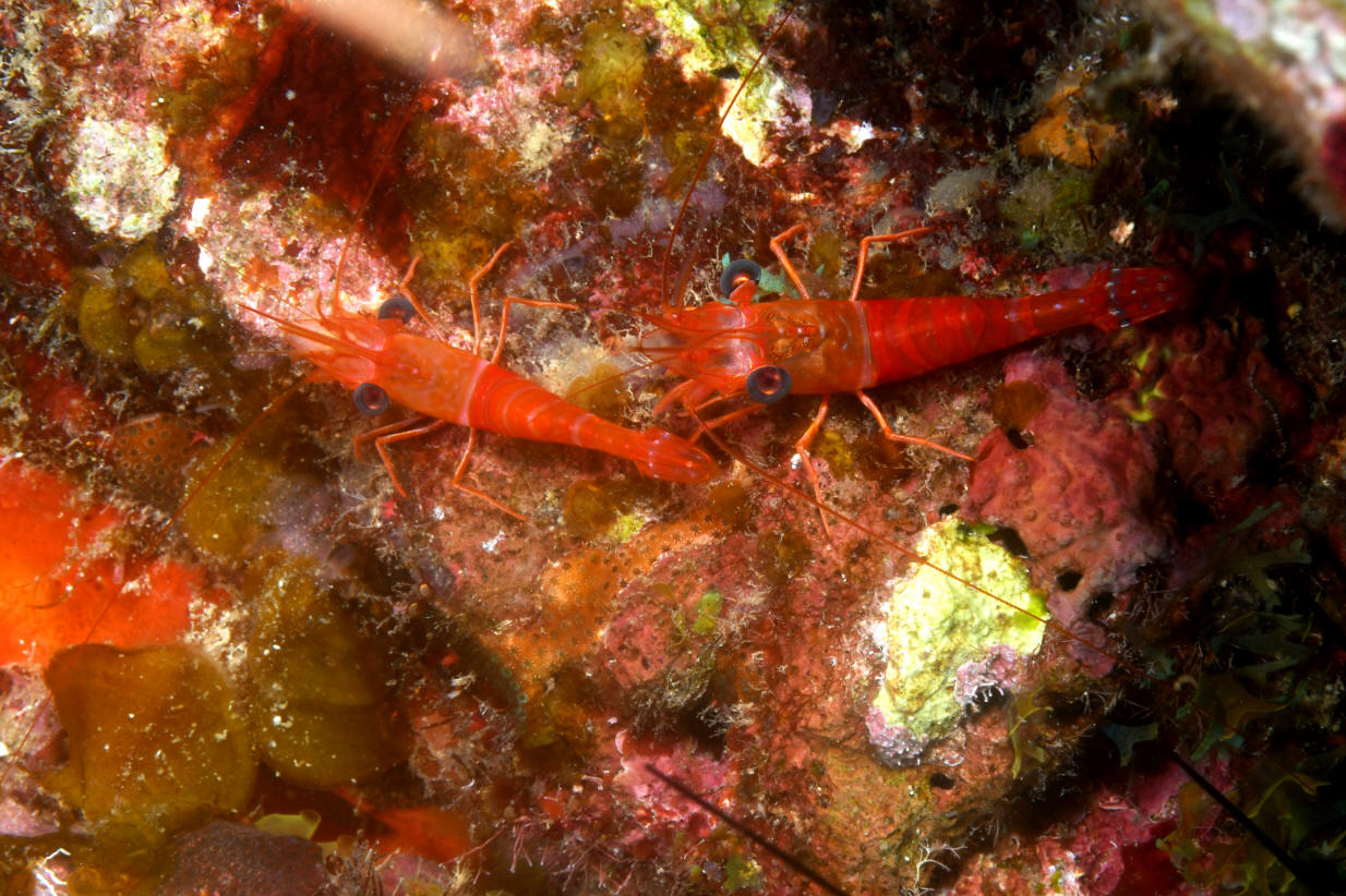Cinetorhynchus manningi Red Night Shrimp. Red to orange bodied, large red spot dorsally; light-colored bands on abdomen to 2". Big eyes on short stalks; nocturnal. A juvenile shot at night by SaraL in Roatan 2019.