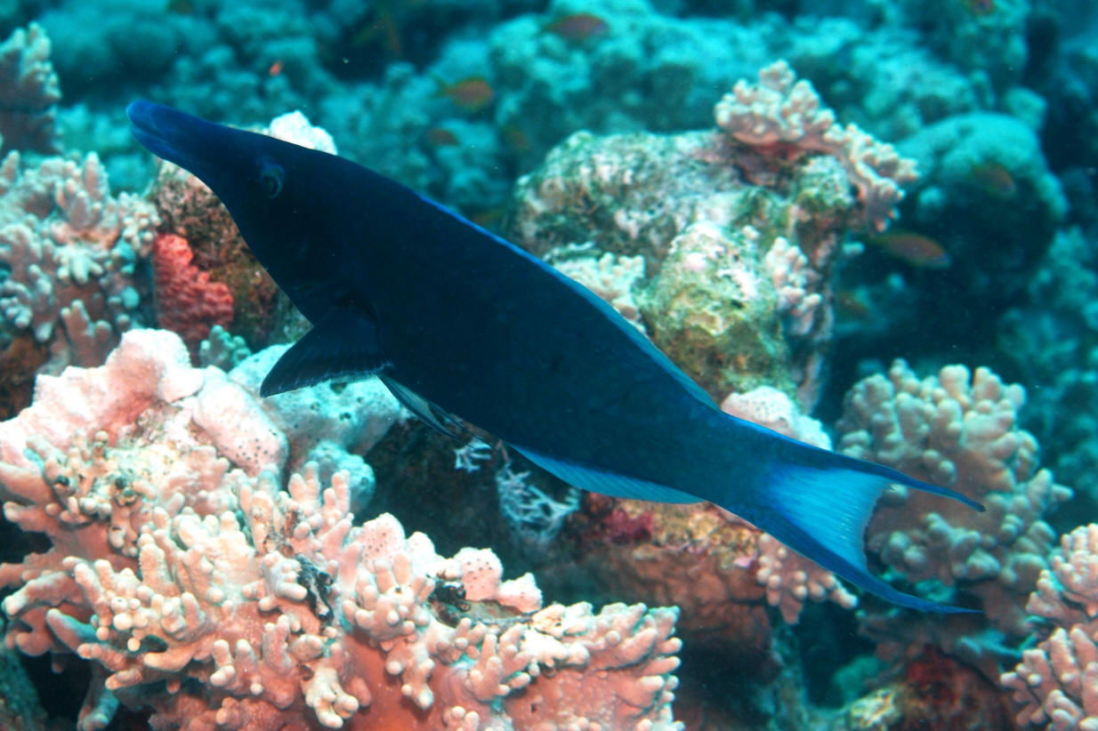 Gomphosus caeruleus Lacepede 1801, the Blue, or Red Sea Bird